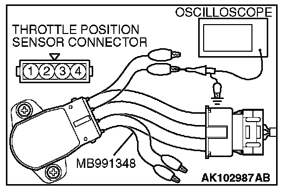 1. Disconnect the throttle position sensor connector and connect the test harness special tool (MB991348) in between.(All terminals should be connected.)