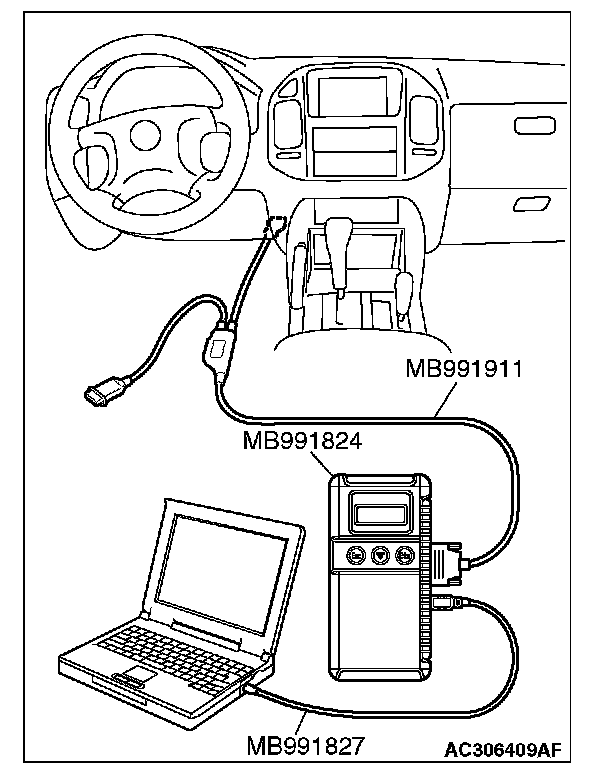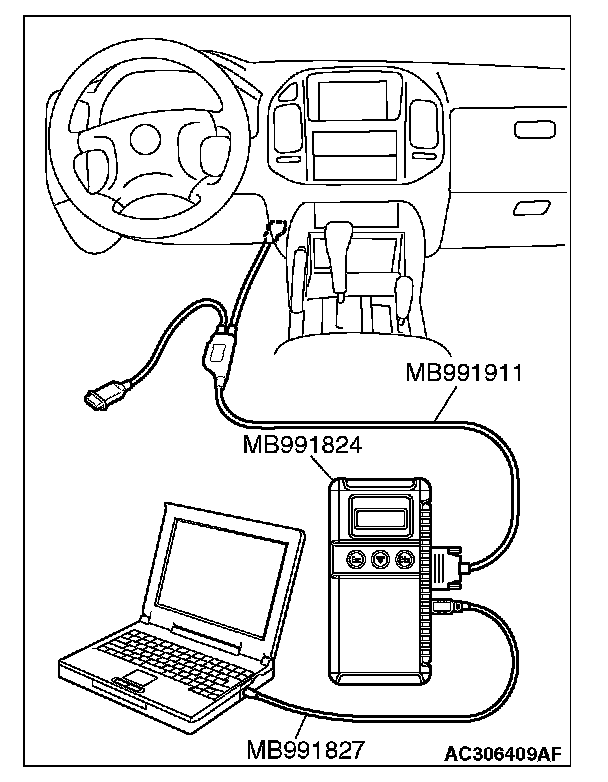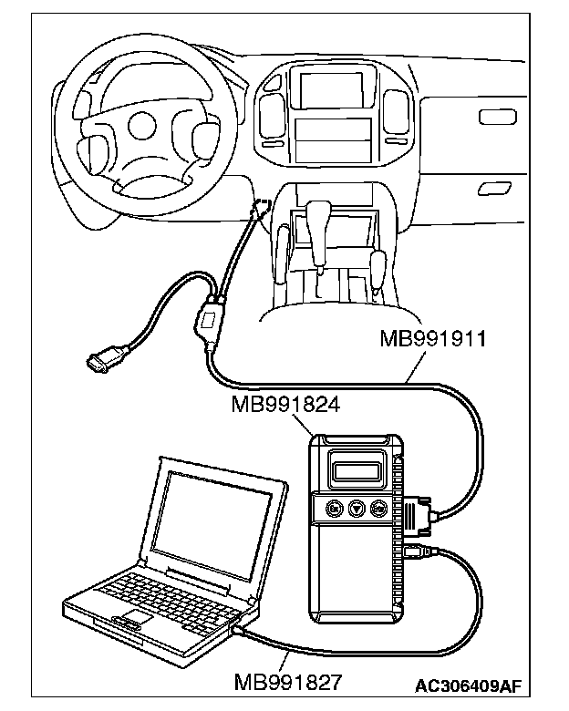 CAUTION: To prevent damage to scan tool MB991958, always turn the ignition switch to "LOCK" (OFF) position before connecting or disconnecting scan tool MB991958.