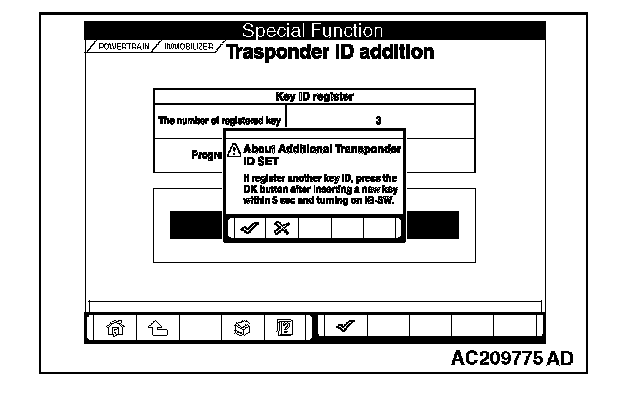 6. If an additional registration is made successfully, the screen will ask if another key is registered or not. If the third ignition key is registered, remove the key, which has been registered. Then insert the third key within five seconds, and then turn it to the ON position.
