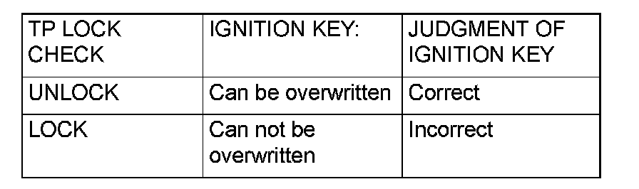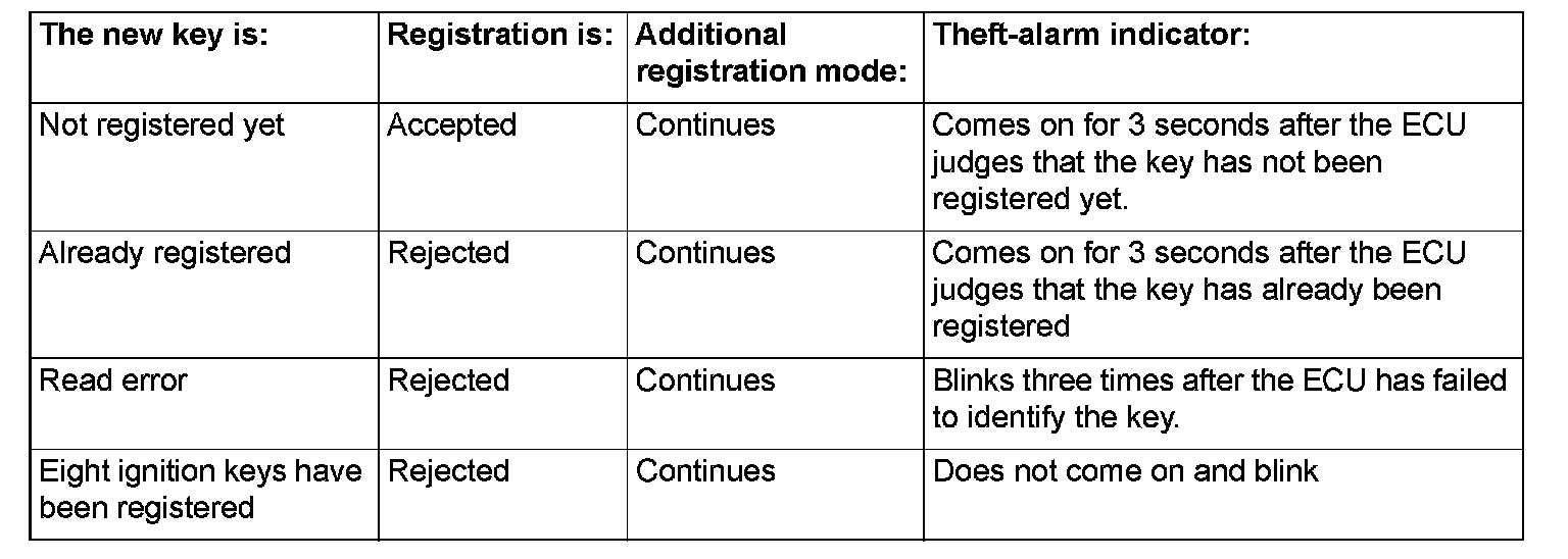 6. The immobilizer-ECU identifies the new key to accept or reject it, and operates the theft-alarm indicator (See the table above).