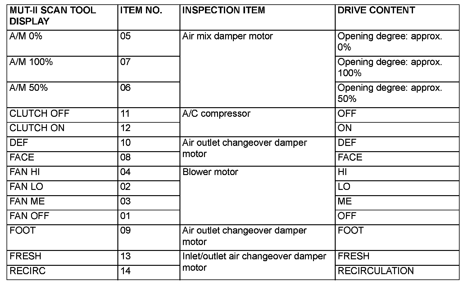 Actuator Test Reference Table: