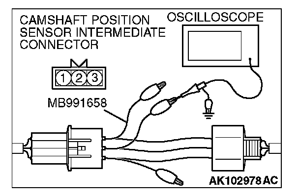 1. Disconnect the camshaft position sensor intermediate connector, and connect the test harness special tool (MB991658) in between. (All terminals should be connected.)