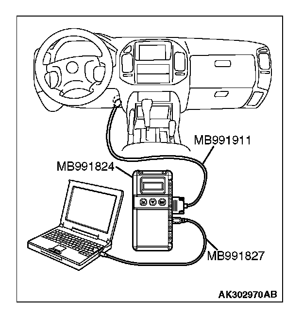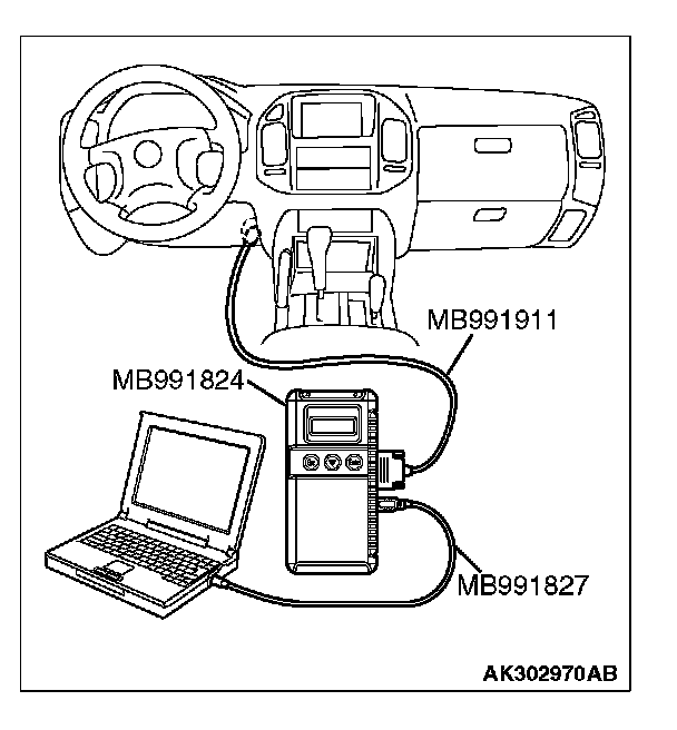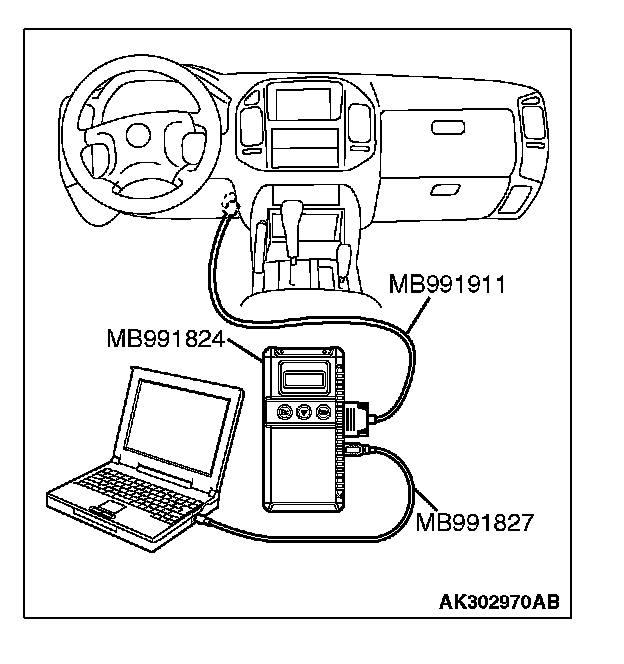 CAUTION: To prevent damage to scan tool MB991958, always turn the ignition switch to the "LOCK" (OFF) position before connecting or disconnecting scan tool MB991958.