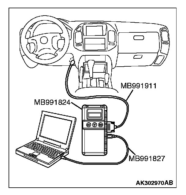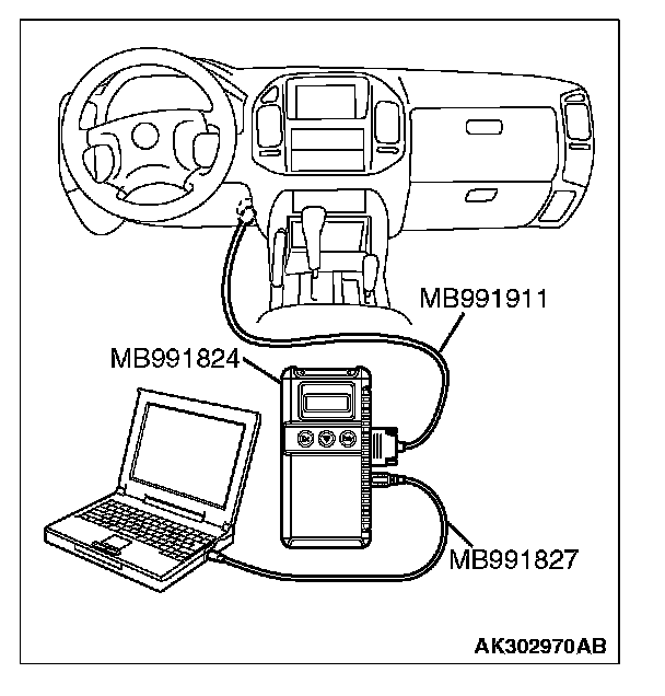 CAUTION: To prevent damage to scan tool MB991958, always turn the ignition switch to the "LOCK" (OFF) position before connecting or disconnecting scan tool MB991958.