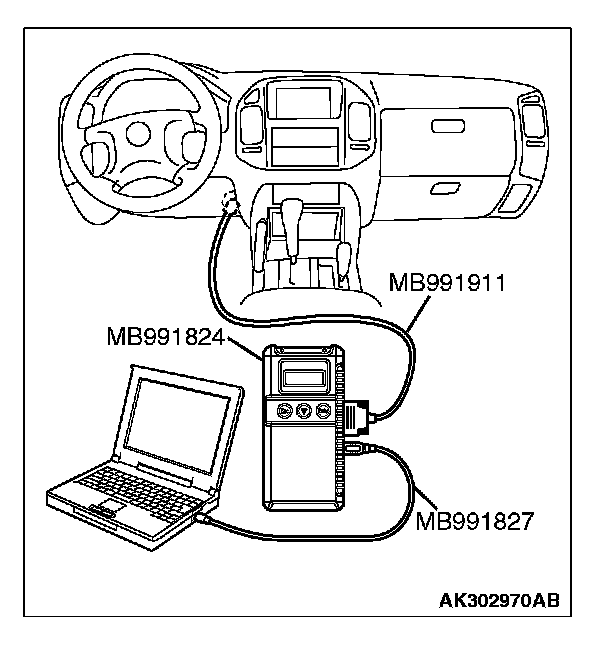 CAUTION: To prevent damage to scan tool MB991958, always turn the ignition switch to the "LOCK" (OFF) position before connecting or disconnecting scan tool MB991958.