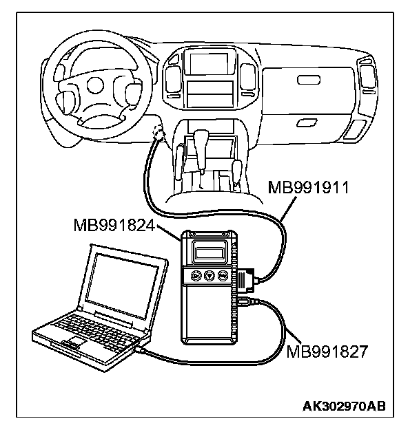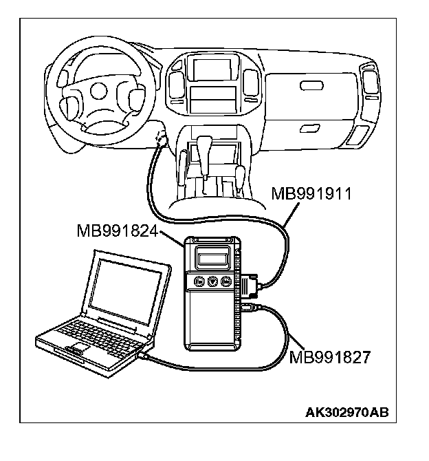 CAUTION: To prevent damage to scan tool MB991958, always turn the ignition switch to the "LOCK" (OFF) position before connecting or disconnecting scan tool MB991958.