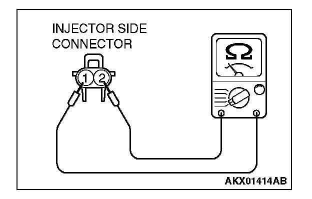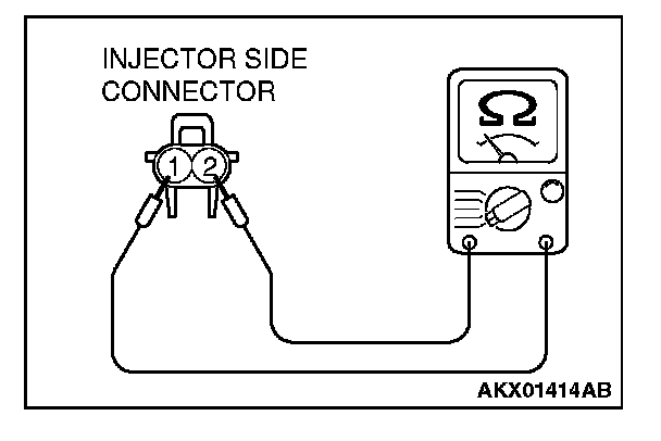3. Measure the resistance between injector side connector terminal No. 1 and No. 2.