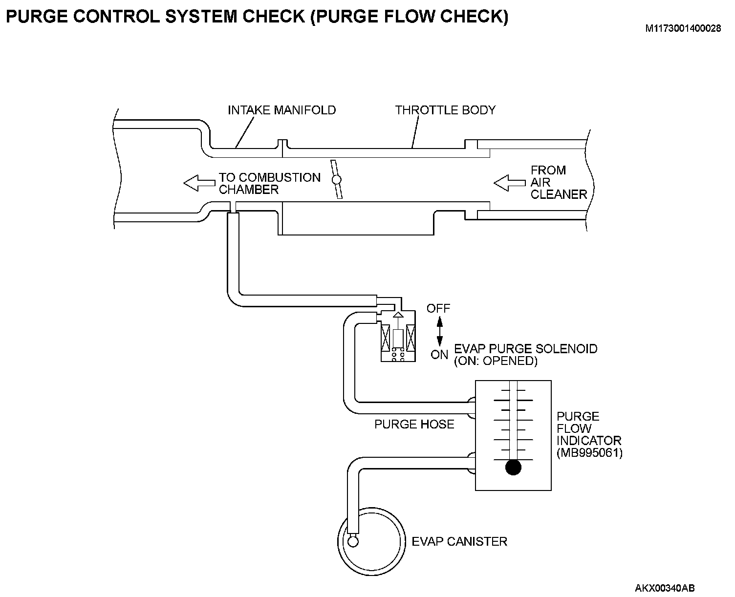 1. Disconnect the purge hose from the evaporative emission (EVAP) purge solenoid, and connect the special tool MB995061 between the EVAP purge solenoid and the purge hose.