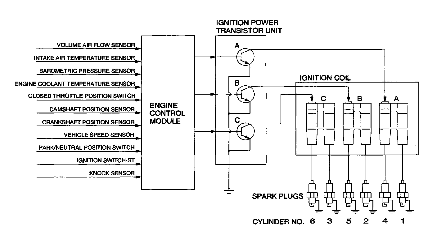 This system is provided with three ignition coils (A, B and C) and three ignition power transistors (A, B and C) for the number 1 and number 4 cylinders, number 2 and number 5 cylinders and number 3 and number 6 cylinders respectively.