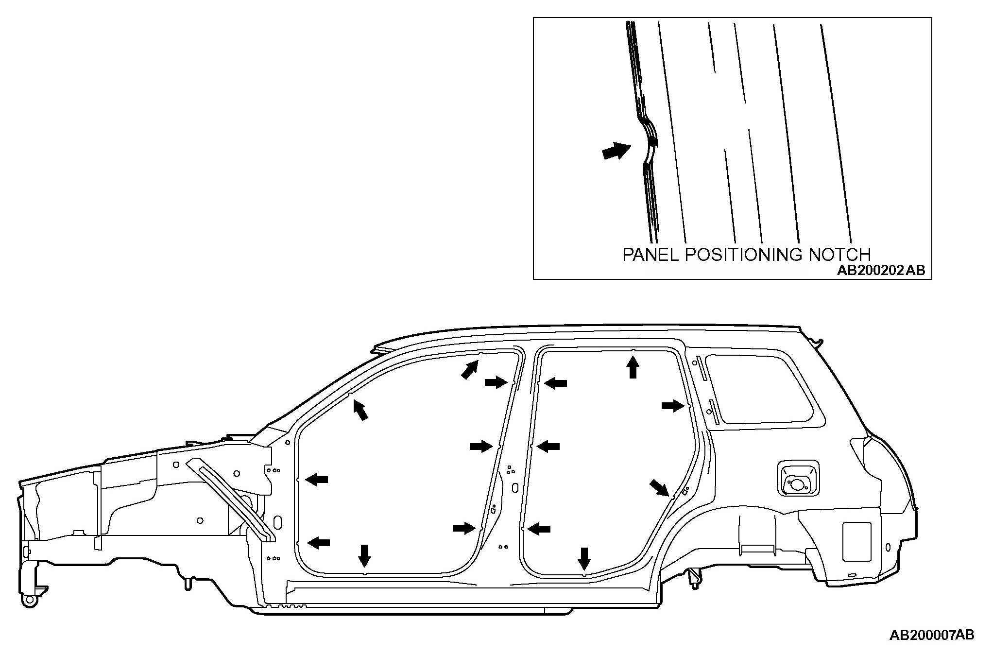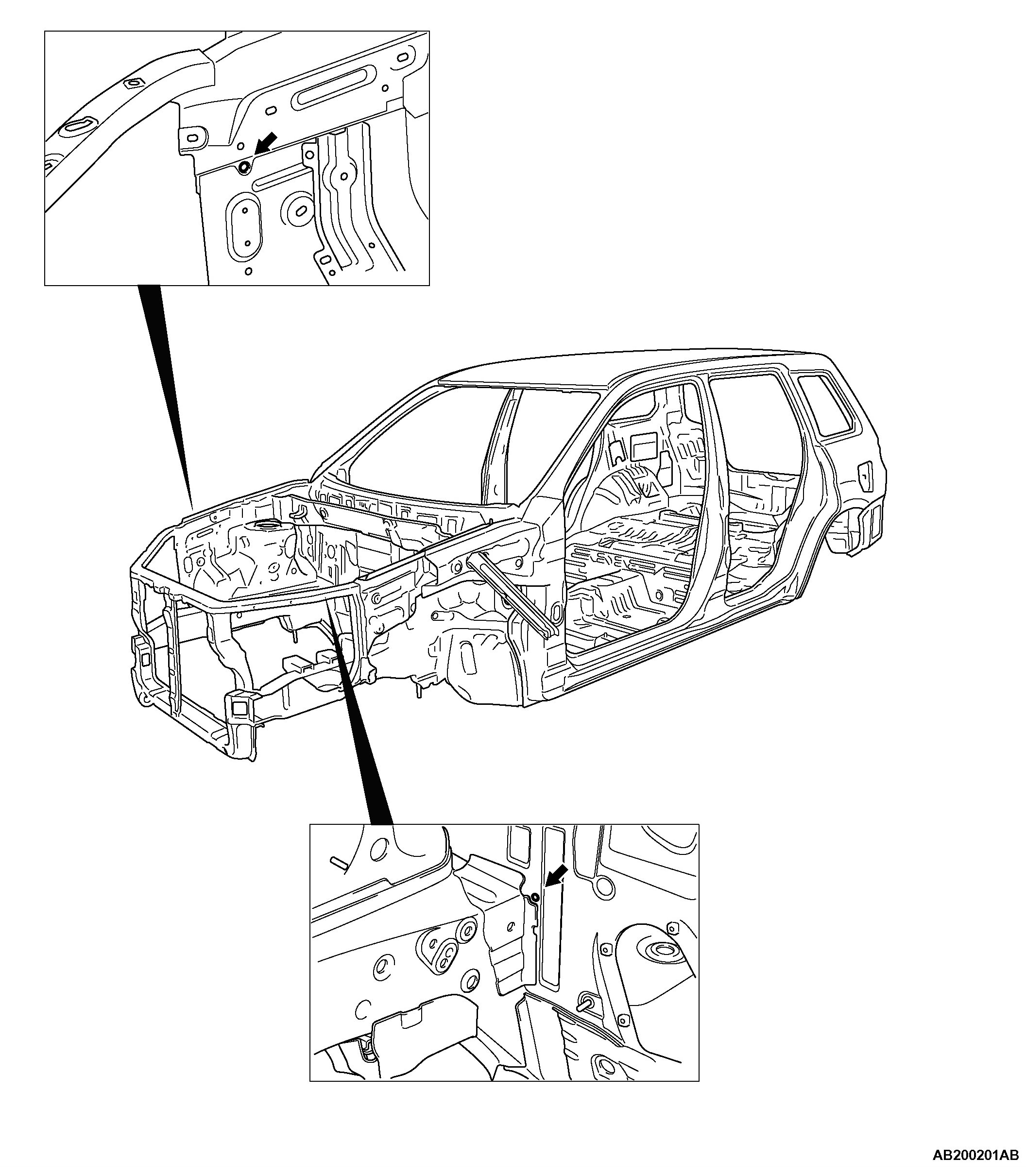A positioning hole, marking and cut-out has been added on the front fender shield, front upper frame inner, front side member gusset rear and dash panel to improve assembling workability when replacing the panel.