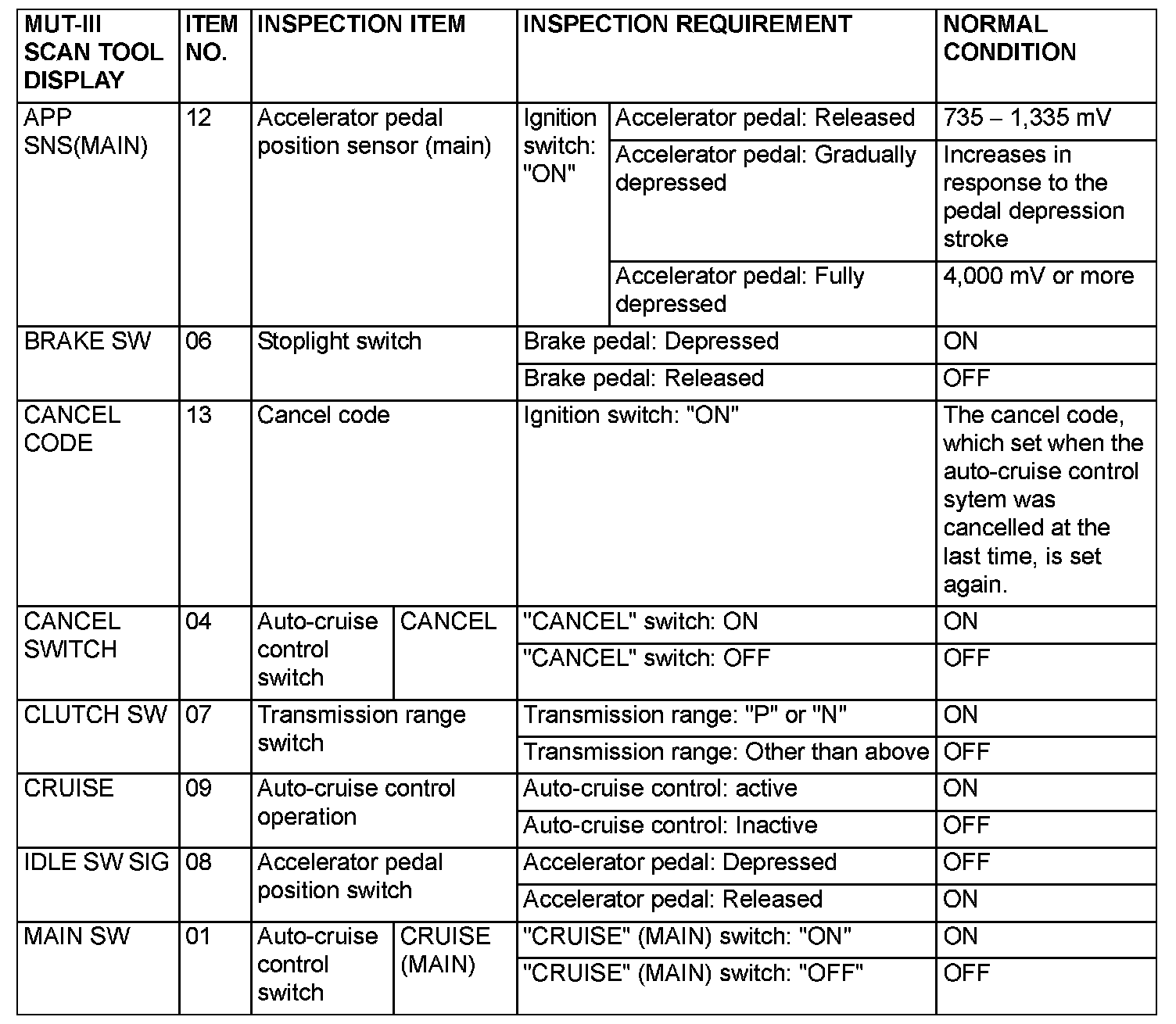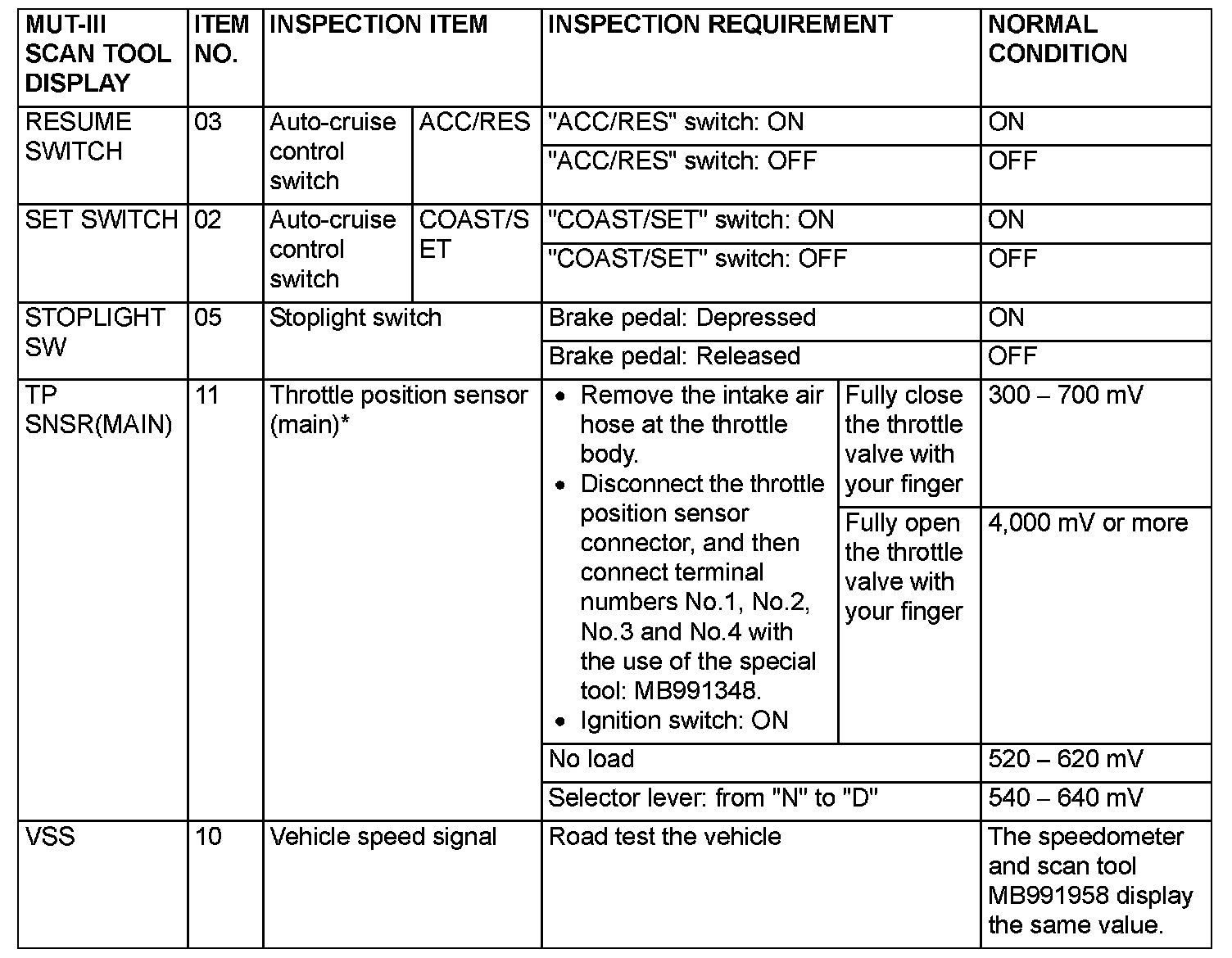 NOTE: *:Disconnect the throttle position sensor connector, and then delete the diagnostic trouble code that was recorded during the inspection with the use of scan tool MB991958 after the inspection has been completed.