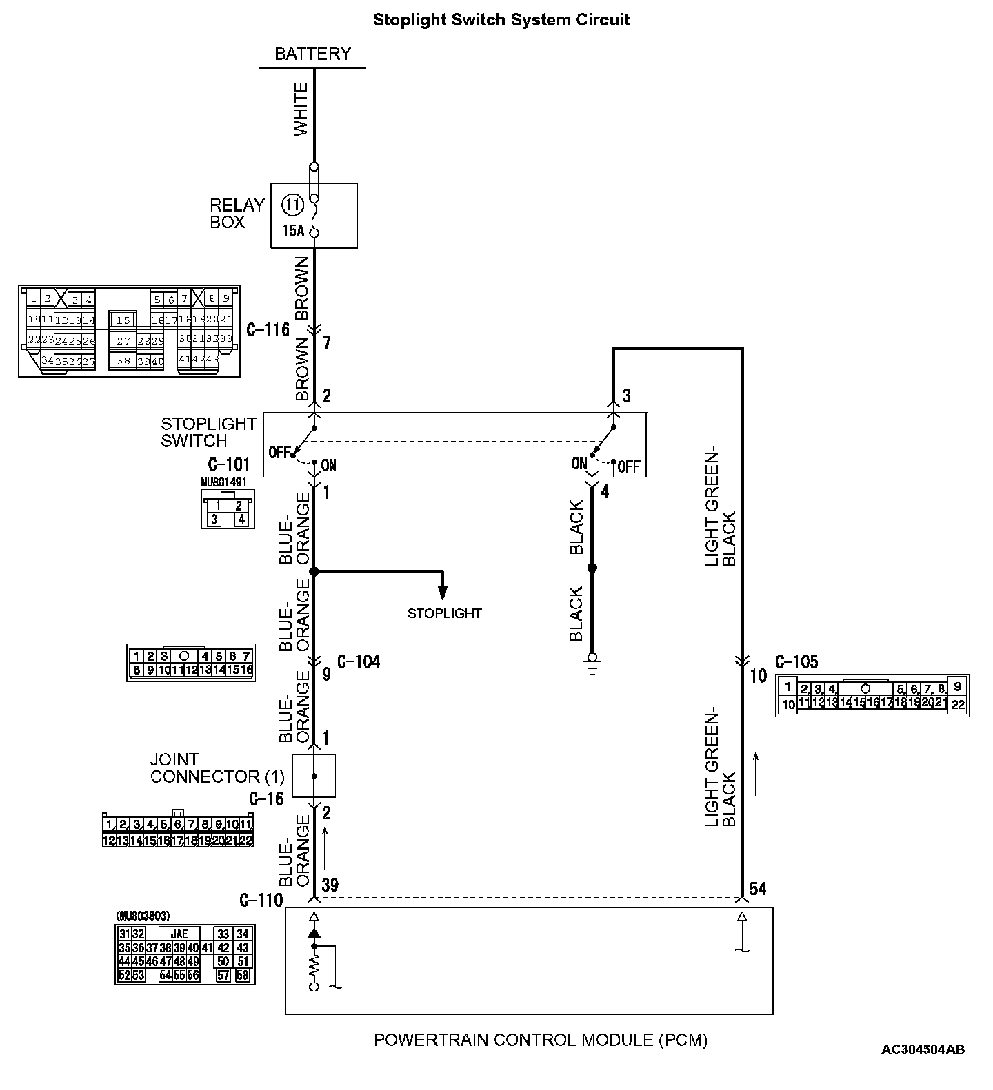 STEP 19. Check the harness wire between PCM connector C-110 terminal 54 and stoplight switch connector C-101 terminal 3 for damage.
