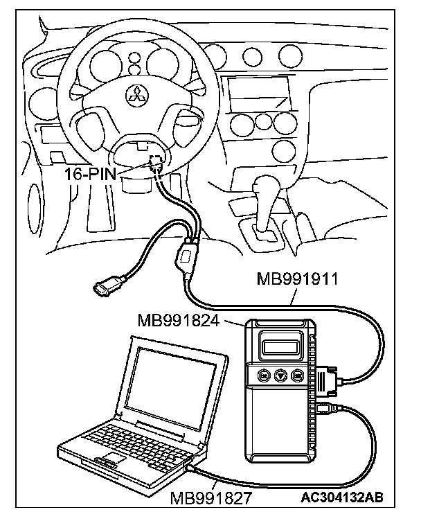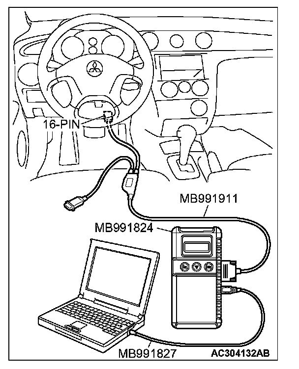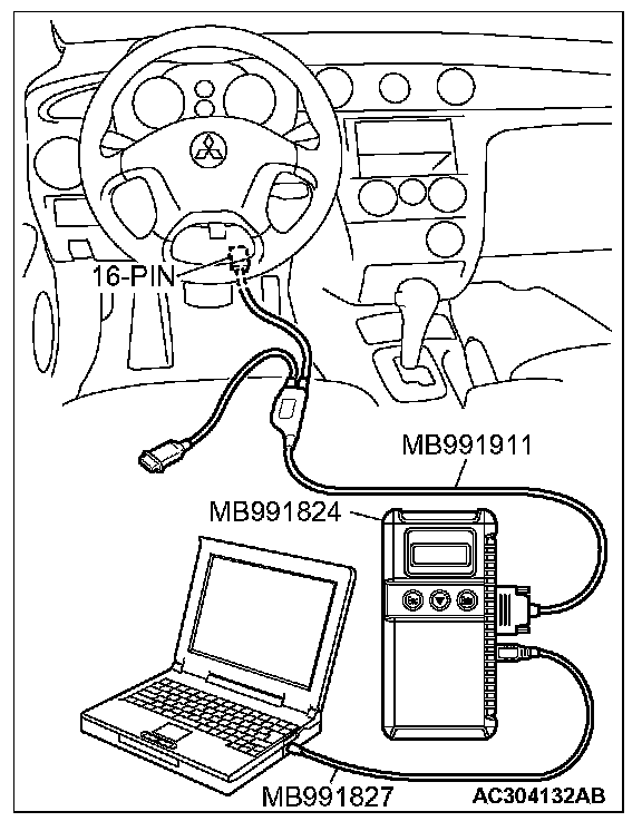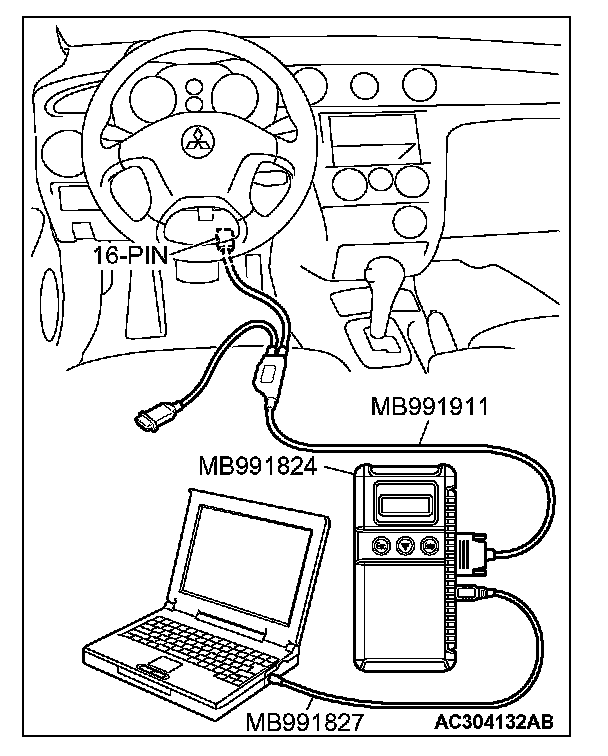 CAUTION: To prevent damage to scan tool MB991958, always turn the ignition switch to the "LOCK" (OFF) position before connecting or disconnecting scan tool MB991958.