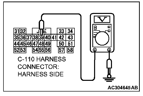 3. Measure the terminal voltage between PCM connector C-110 terminal 39 and ground by backprobing.