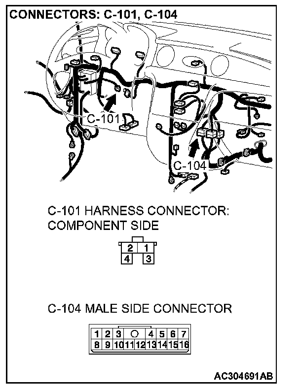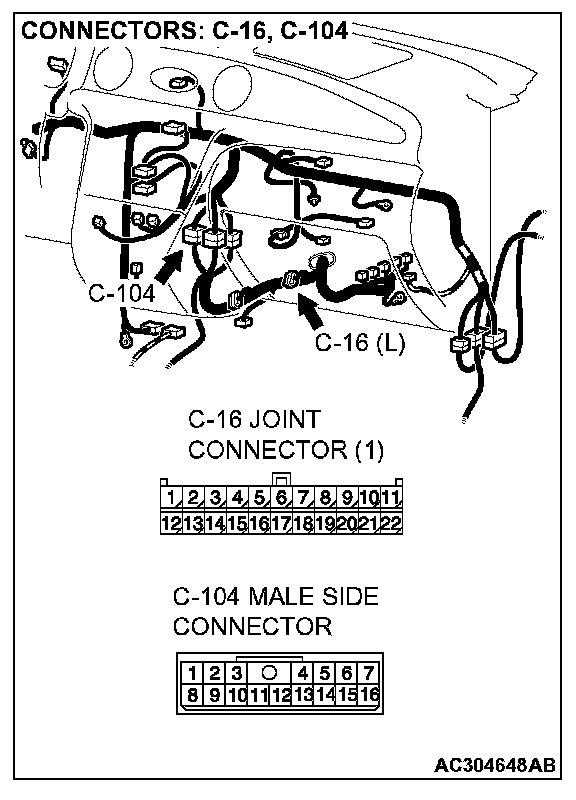 STEP 4. Check PCM connector C-110, joint connector (1) C-16, intermediate connector C-104 and stoplight switch connector for loose, corroded or damaged terminals, or terminals pushed back in the connector.