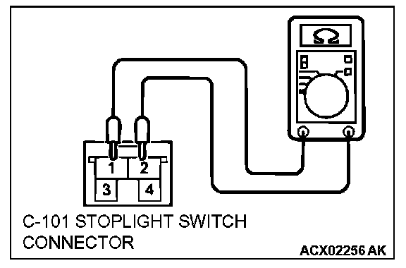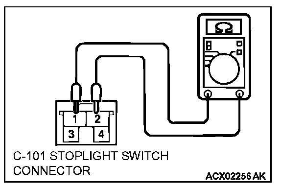 2. Connect an ohmmeter to the stoplight switch between terminals 1 and 2.