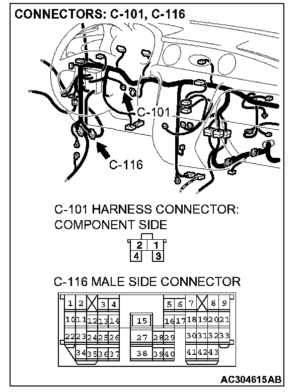 STEP 9. Check stoplight switch connector C-101 and intermediate connector C-116 for loose, corroded or damaged terminals, or terminals pushed back in the connector.