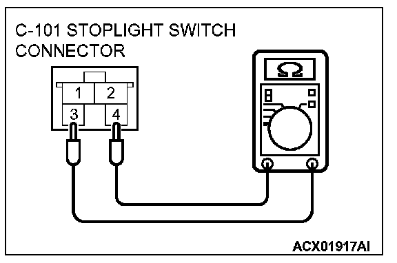 3. Check for continuity between the terminals 3 and 4 when the plunger of the stoplight switch is pushed in and when it is released.