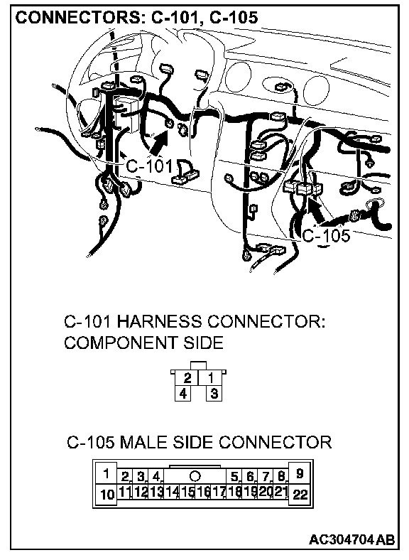 STEP 18. Check PCM connector C-110, intermediate connector C-105 and stoplight switch connector C-101 for loose, corroded or damaged terminals, or terminals pushed back in the connector.