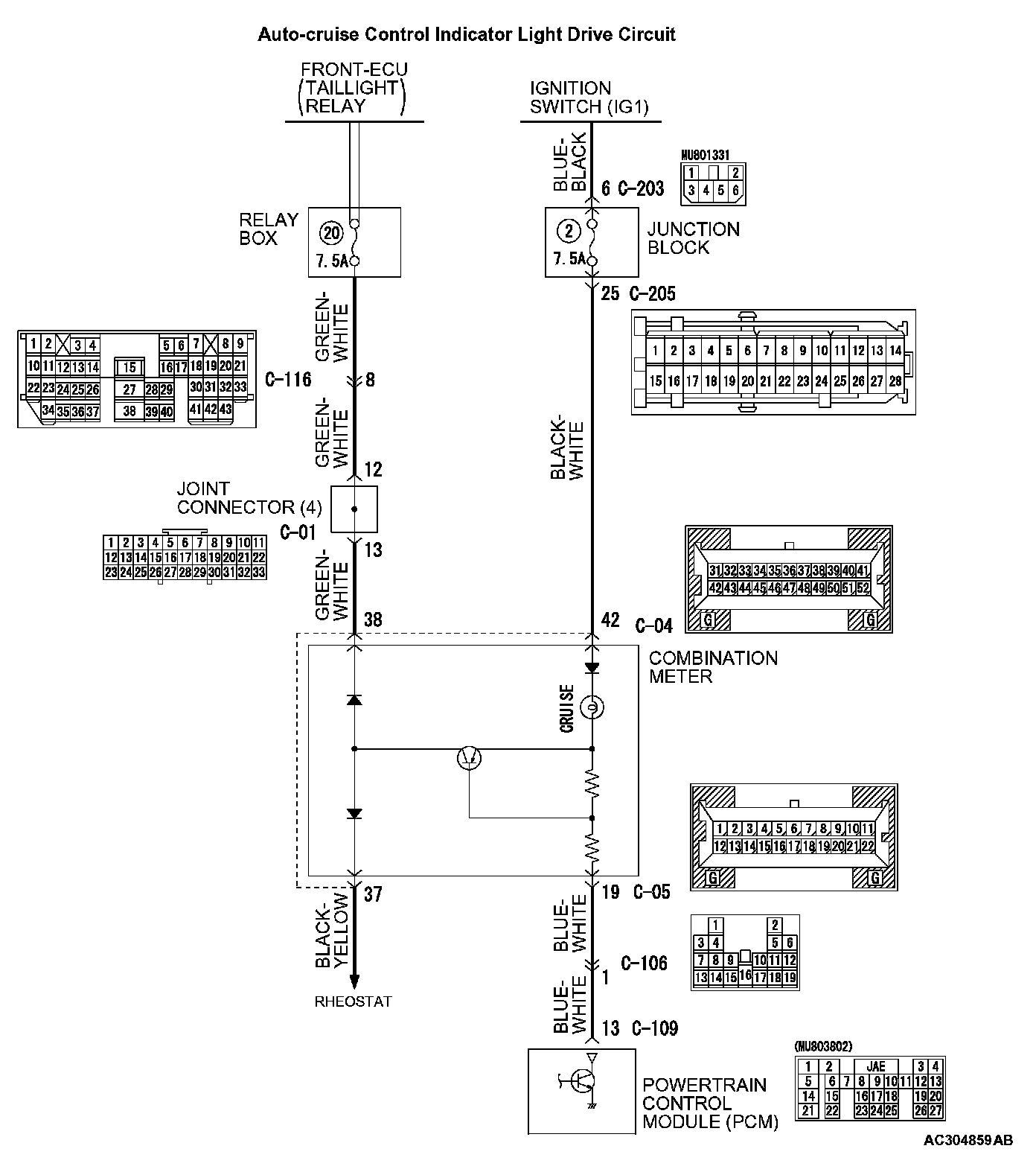 - When "CRUISE" (MAIN) switch to the "ON" position, the voltage should measure 0.5 volt or less.