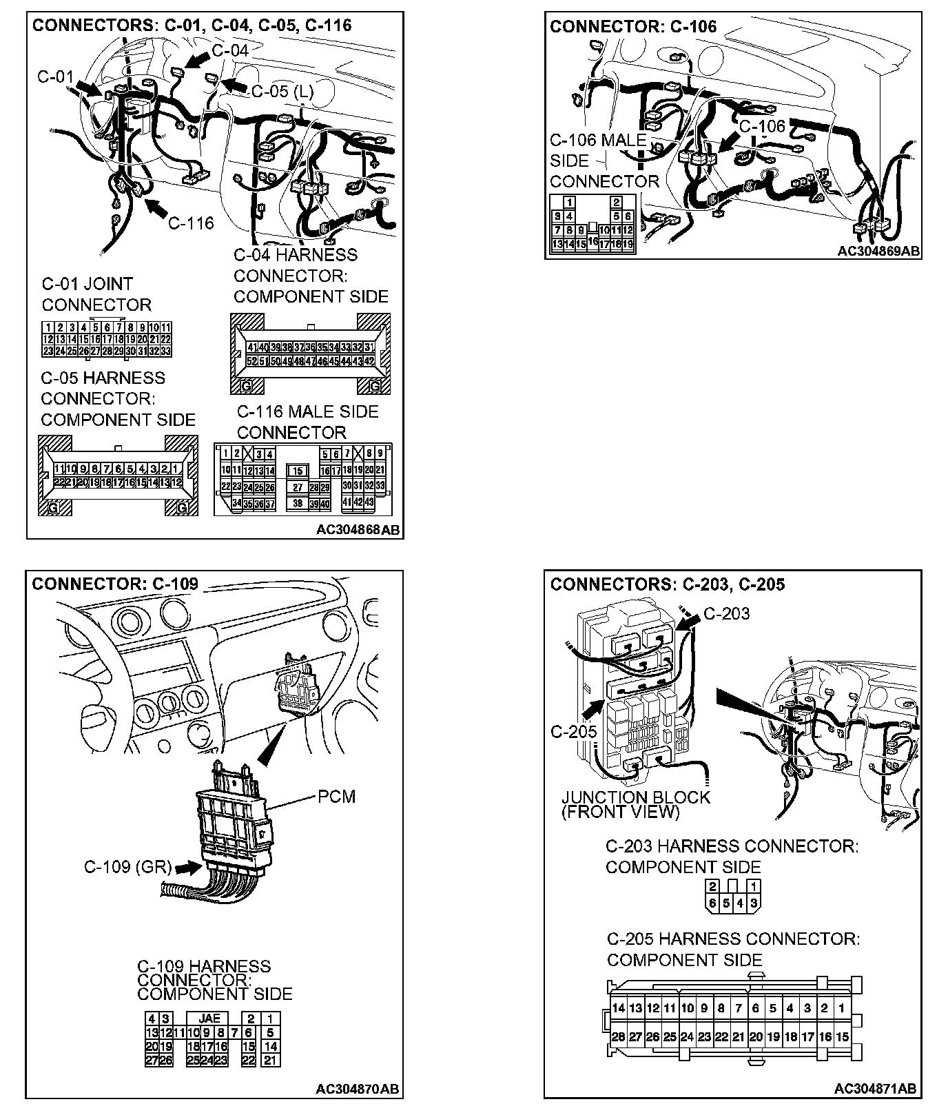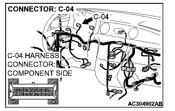 STEP 2. Check combination meter connector C-04 and junction block connector C-205 for loose, corroded or damaged terminals, or terminals pushed back in the connector.