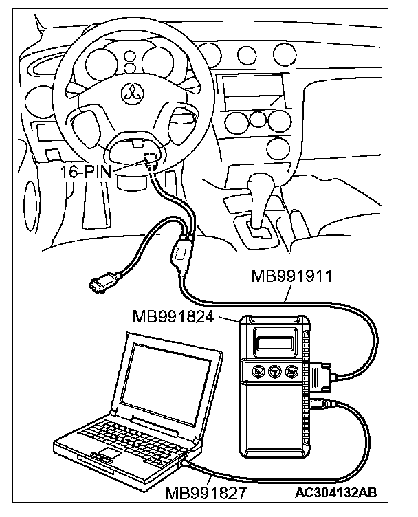 CAUTION: To prevent damage to scan tool MB991958, always turn the ignition switch to the "LOCK" (OFF) position before connecting or disconnecting scan tool MB991958.