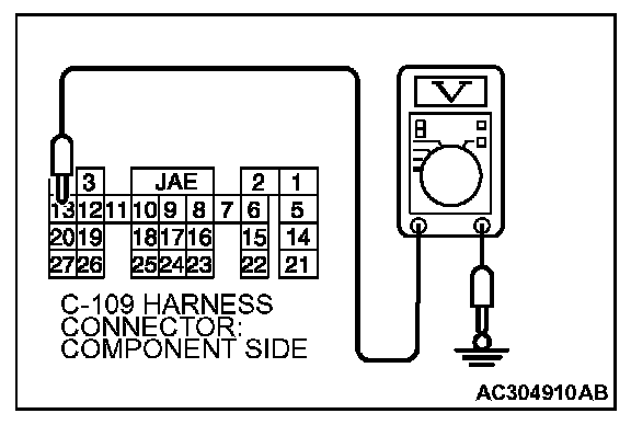 3. Measure the terminal voltage between PCM connector C-109 terminal 13 and ground.