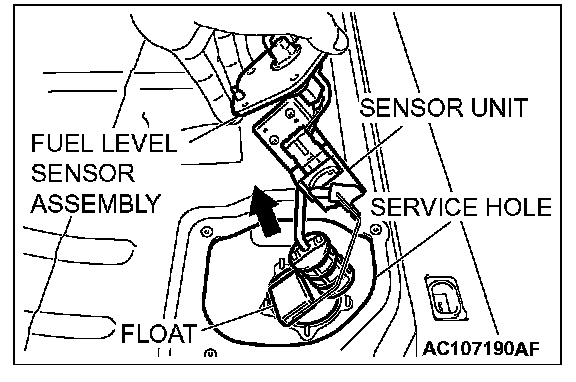 CAUTION: Pay attention not to damage the sensor unit and the float of the fuel level sensor assembly when withdrawing it from the service hole.