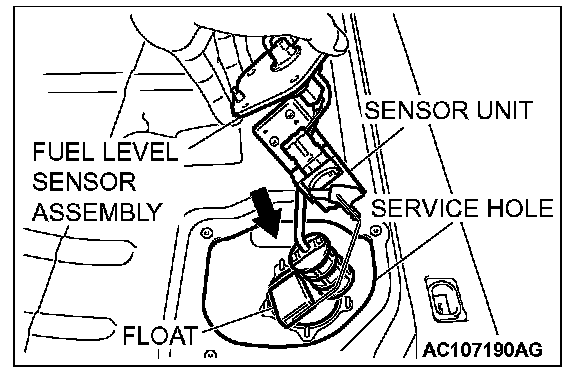 CAUTION: Pay attention not to damage the sensor unit and the float of the fuel level sensor assembly when inserting it from the service hole.