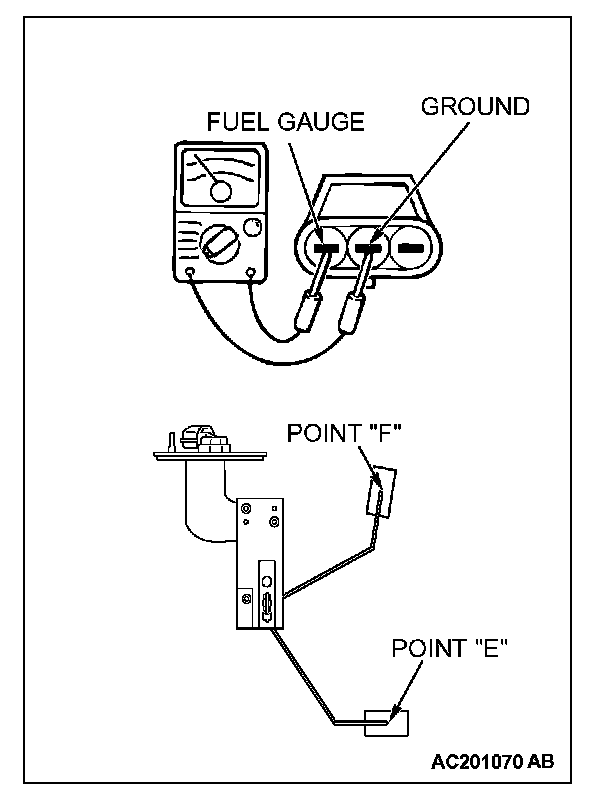 1. Check that resistance value between the fuel gauge terminal and ground terminal is at the standard value when the fuel level sensor float is between point "F" (highest) and point "E" (lowest).