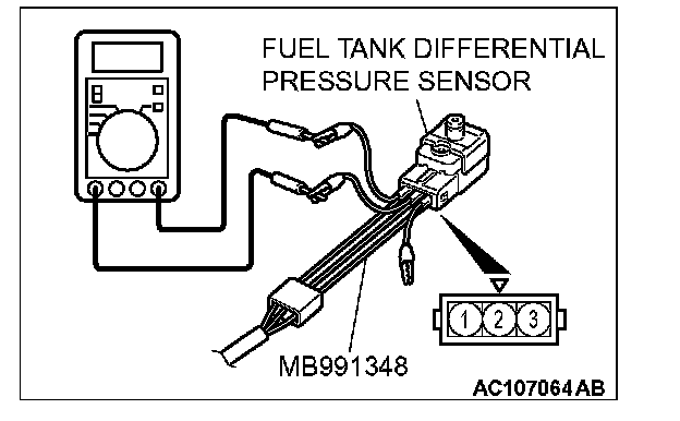 1. Disconnect the fuel tank differential pressure sensor connector and connect special tool MB991348 between the terminals of the disconnected connector.