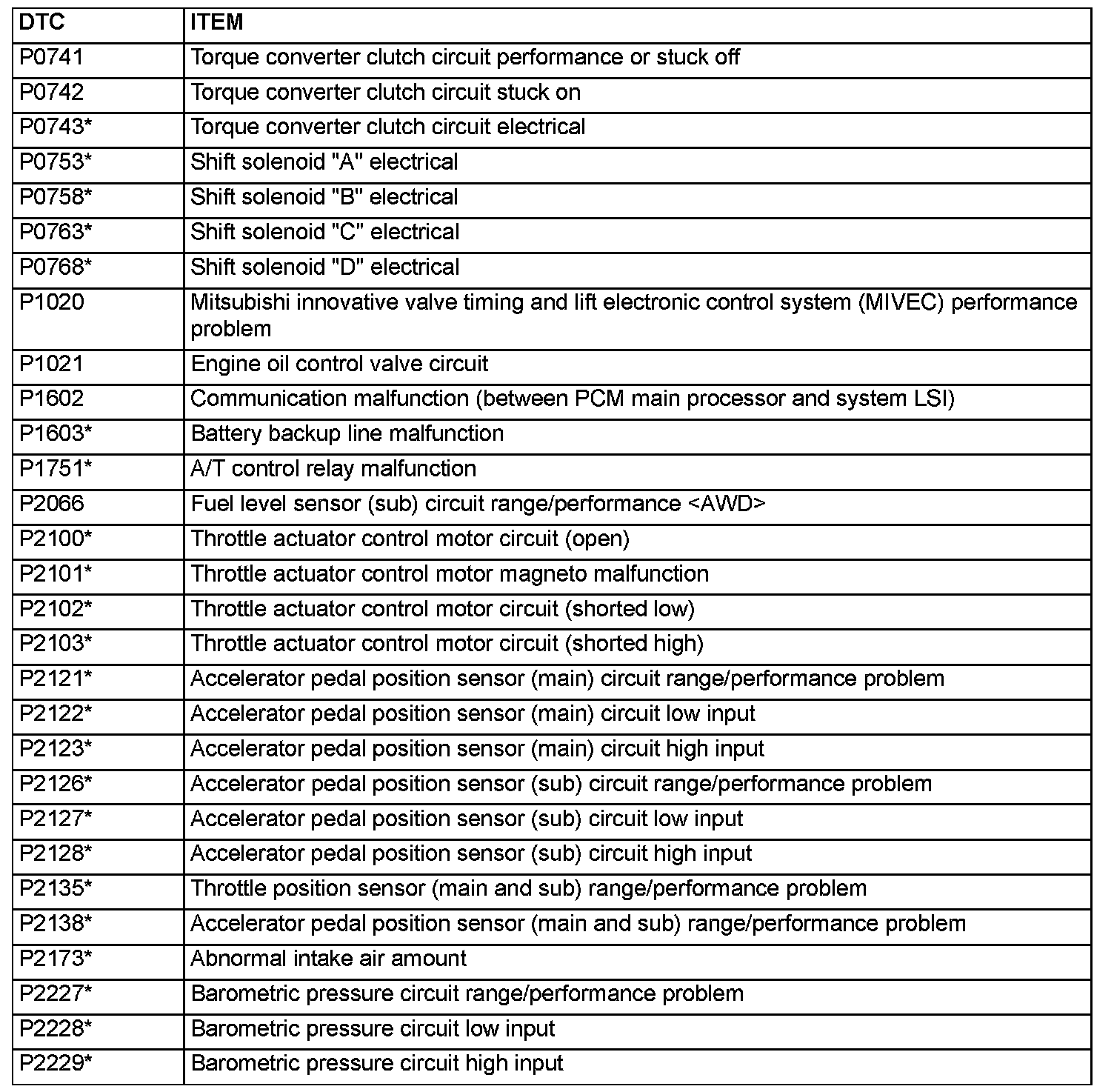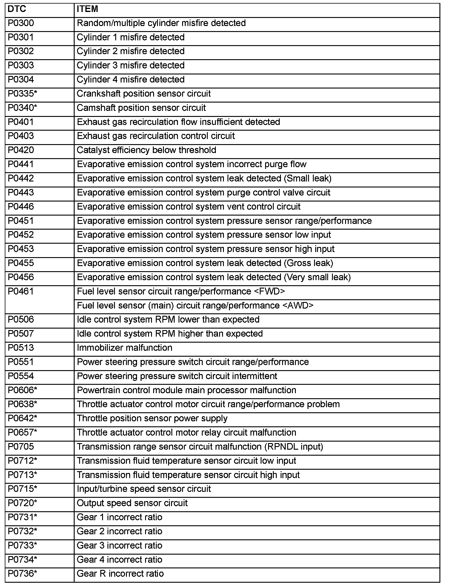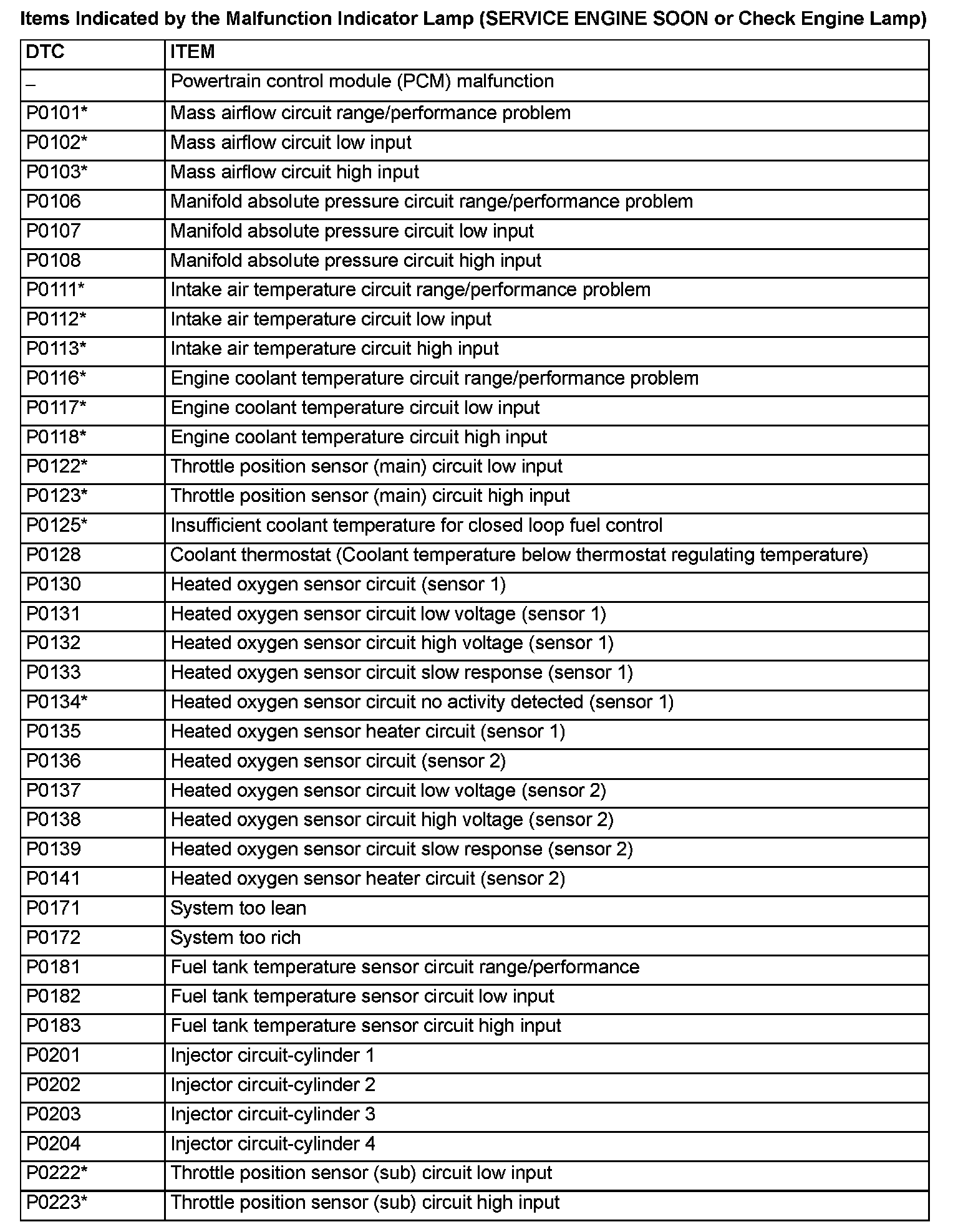 NOTE: After the PCM has detected a malfunction, the Malfunction Indicator Lamp (SERVICE ENGINE SOON or Check Engine Lamp) illuminates when the engine is next turned on and the same malfunction is re-detected. However, for items marked with a "*" in the DTC NO column, the Malfunction Indicator Lamp (SERVICE ENGINE SOON or Check Engine Lamp) illuminates on the first detection of the malfunction.