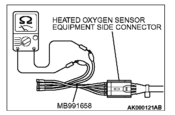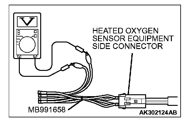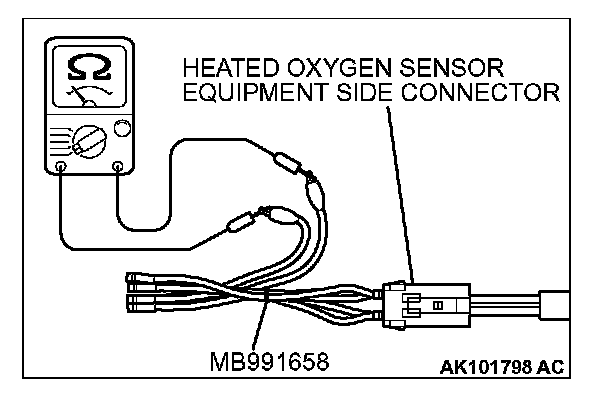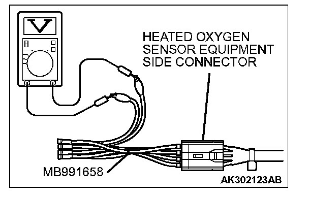 1. Disconnect the heated oxygen sensor connector and connect special tool MB991658 to the connector on the heated oxygen sensor side.