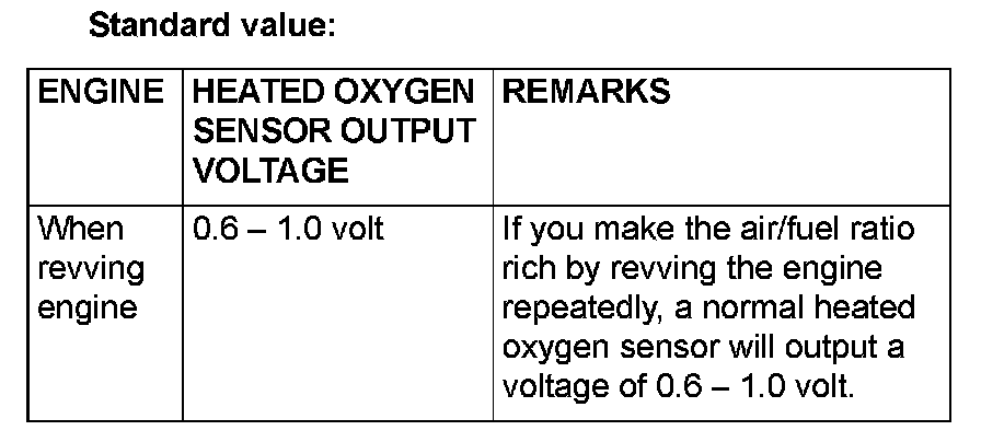 NOTE: If the sufficiently high temperature [of approximate 400 °C (752 °F) or more] is not reached although the heated oxygen sensor is normal, the output voltage would be possibly low although the rich air/fuel ratio. Therefore, if the output voltage is low, use jumper wires to connect the terminal No. 2 and the terminal No. 1 of the heated oxygen sensor with a (+) terminal and (-) terminal of 8 volts power supply respectively, then check again.
