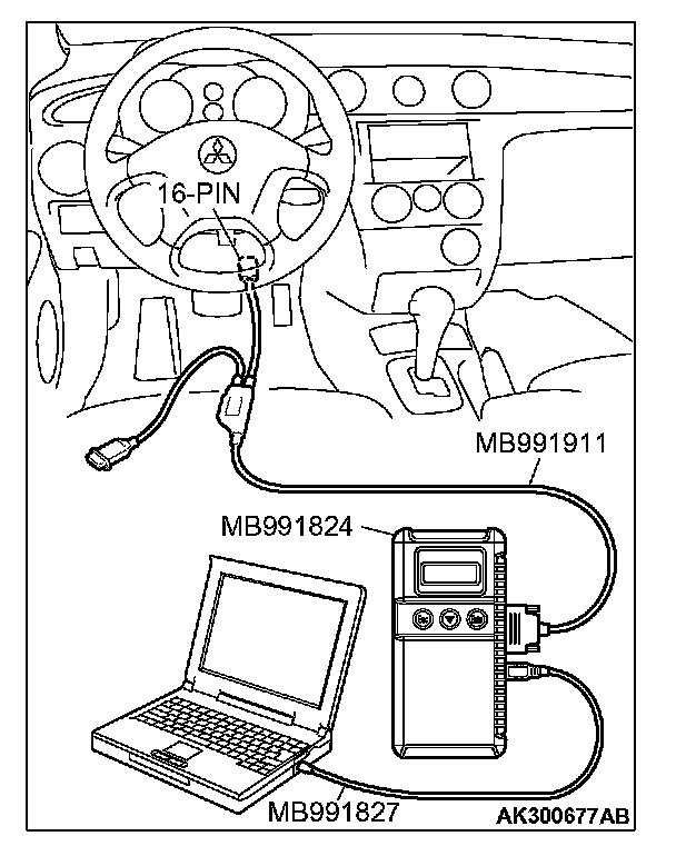 CAUTION: To prevent damage to scan tool MB991958, always turn the ignition switch to the "LOCK" (OFF) position before connecting or disconnecting scan tool MB991958.