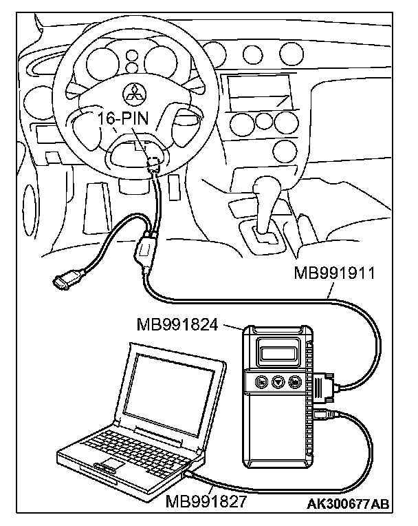 CAUTION: To prevent damage to scan tool MB991958, always turn the ignition switch to the "LOCK" (OFF) position before connecting or disconnecting scan tool MB991958.