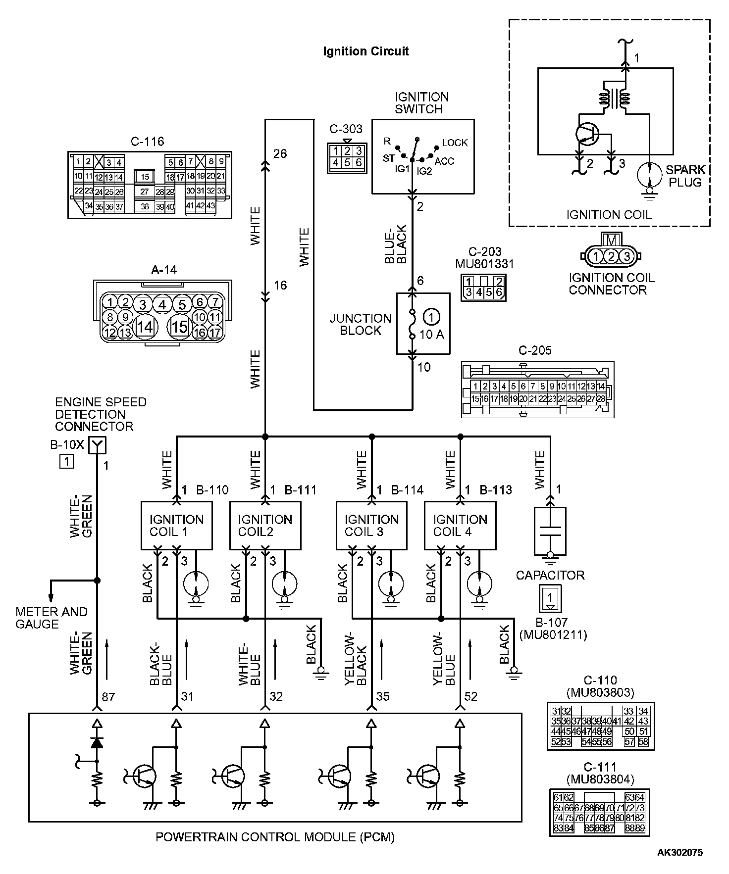 STEP 4. Check for open circuit between ignition switch connector C-303 (terminal No. 2) and ignition coil connectors B-110, B-111, B-113 and B-114 (terminal No. 1).