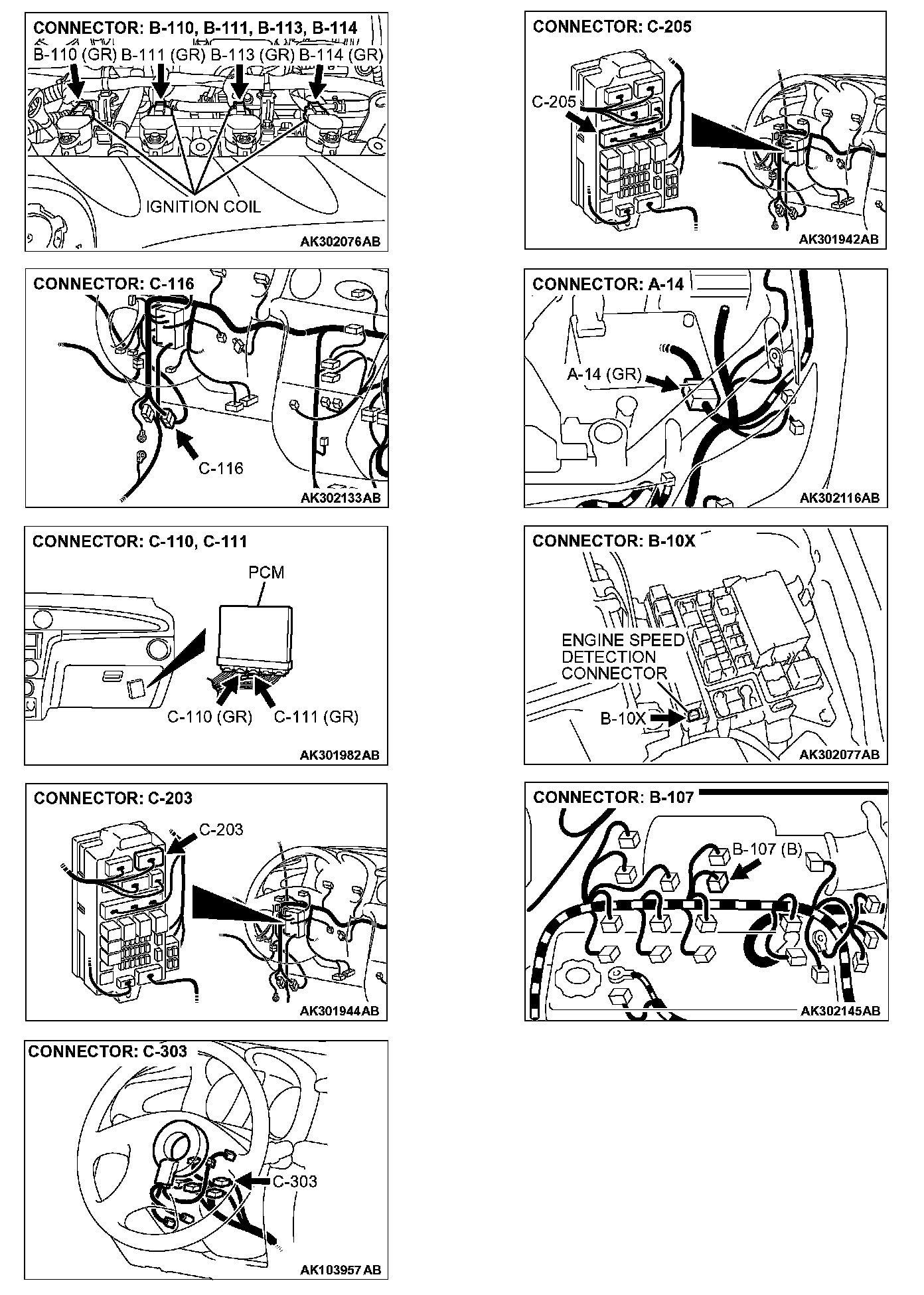 STEP 2. Check harness connector B-110, B-111, B-113 and B-114 at ignition coil for damage.