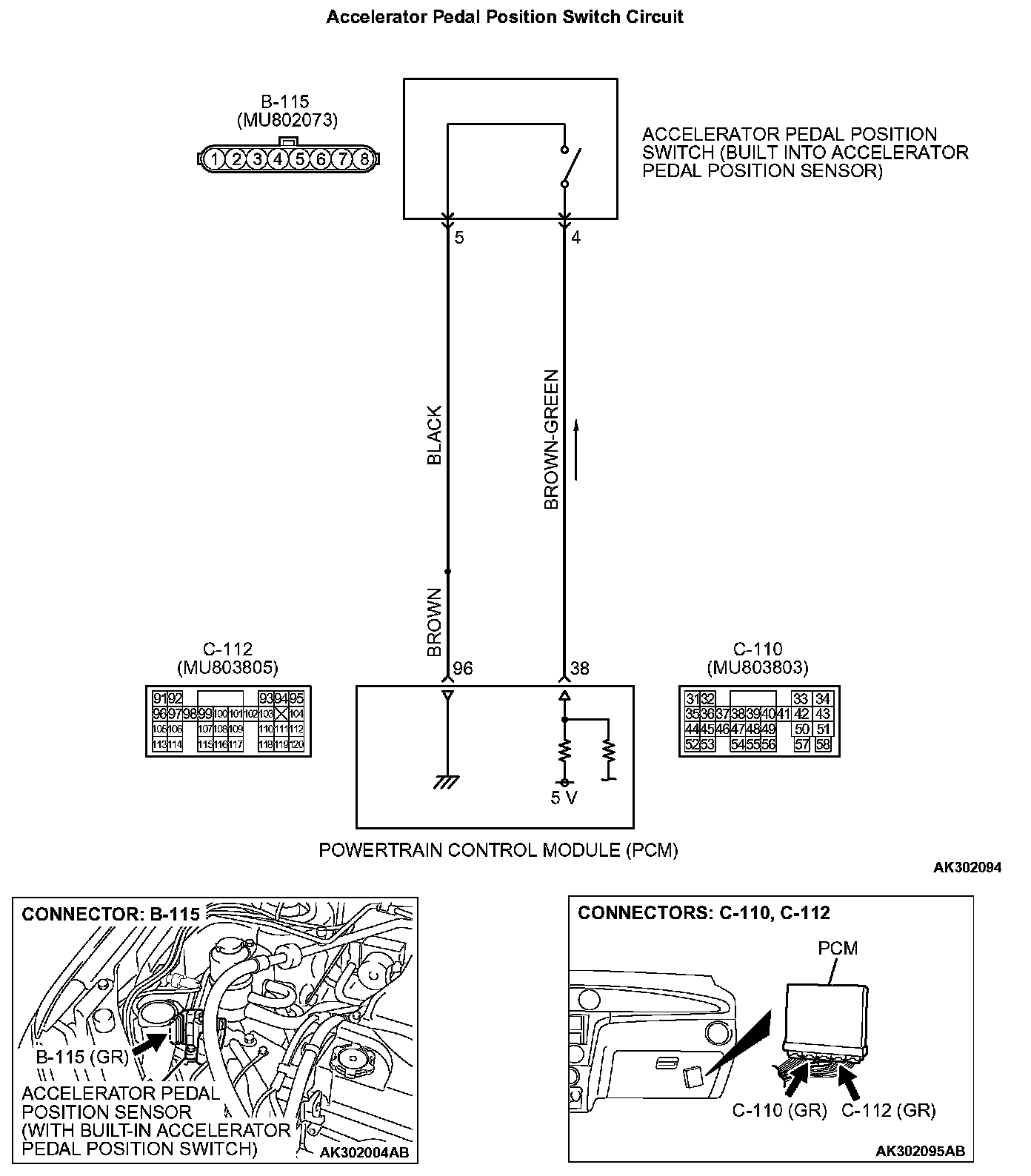 STEP 5. Check for open circuit and short circuit to ground between accelerator pedal position switch connector B-115 (terminal No.4) and PCM connector C-110 (terminal No.38).
