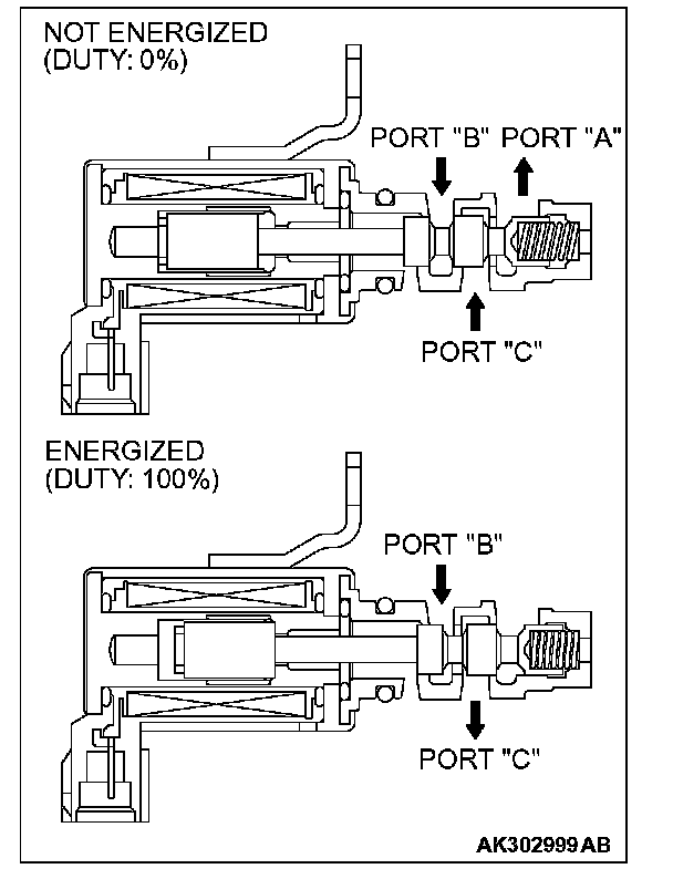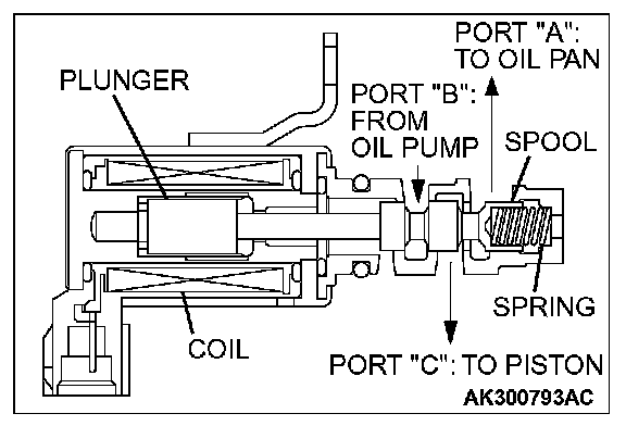 When the coil of the engine oil control valve is not energized (duty cycle: 0%), port B closes, and ports A and C open, allowing the oil that was acting on the cam switching control piston to be discharged from port C via port A. When the coil is energized (duty cycle: 100%), the spool valve moves, closing port A and opening ports B and C. The oil that has been pumped by the oil pump passes via ports B and C, and acts on the cam switching control piston.