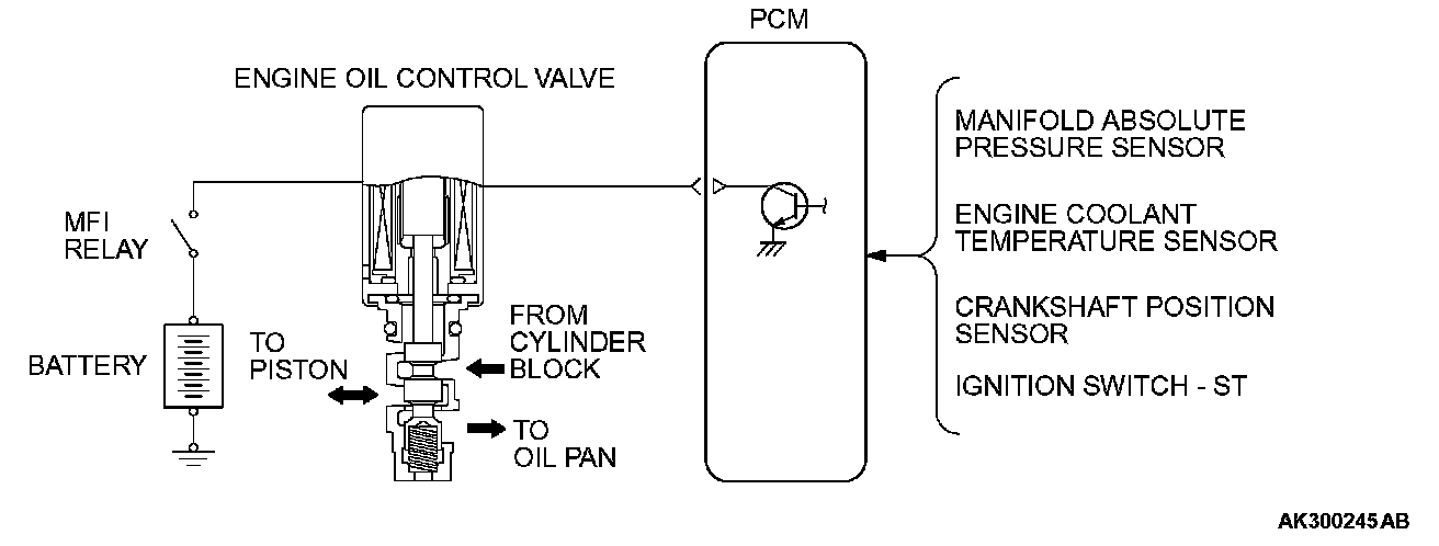The engine oil control valve is a type of solenoid valve that is controlled with duty cycles. Mounted on the cylinder block, this valve is used for hydraulically controlling the switching of cams.