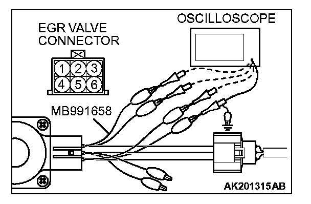 2. Connect the oscilloscope probe to the EGR valve connector terminal No. 1, terminal No. 3, terminal No. 4, No. terminal 6 respectively.