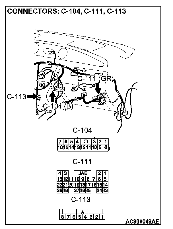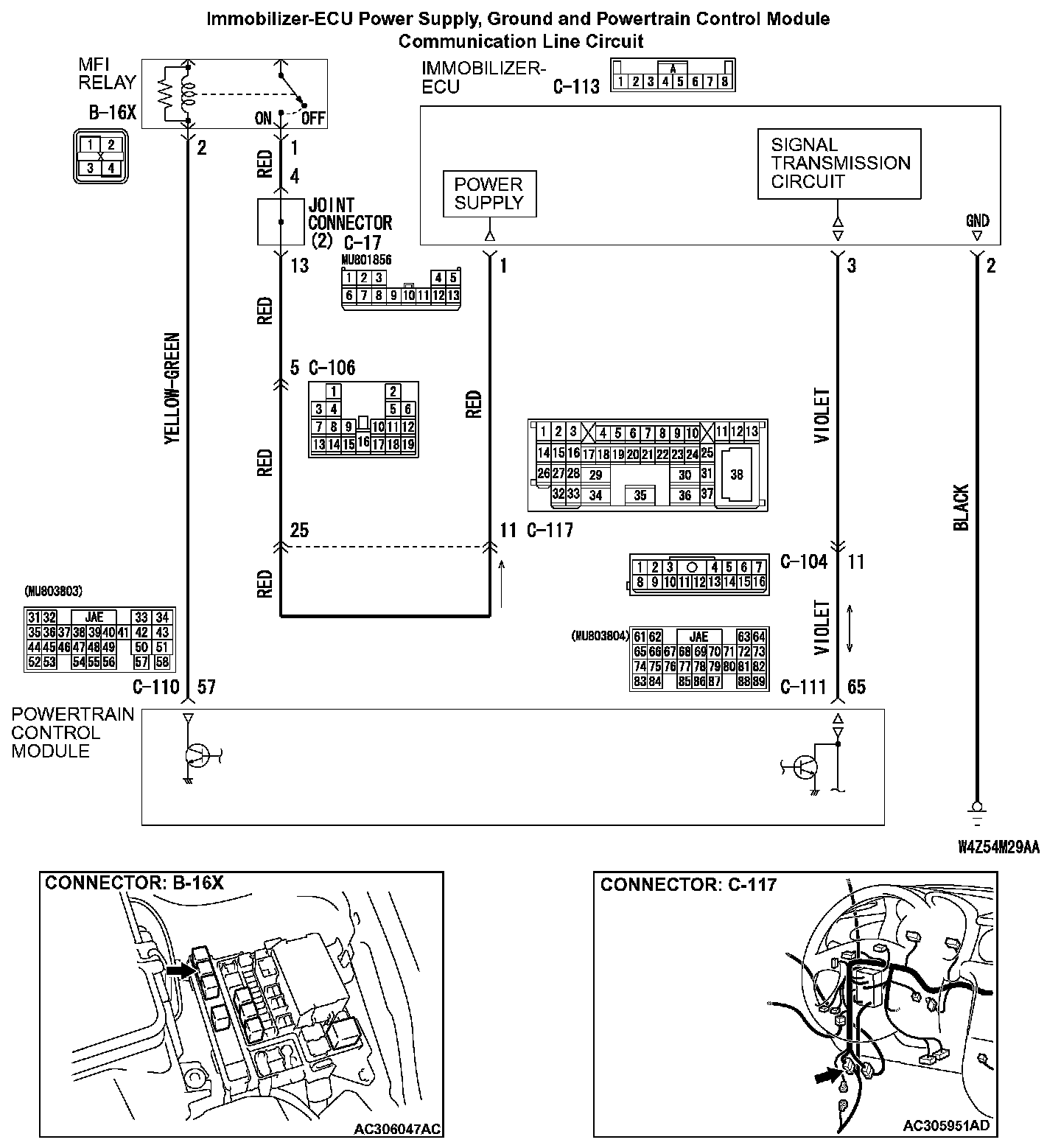 STEP 3. Check immobilizer-ECU connector C-113 and MFI relay connector B-16X for loose, corroded or damaged terminals, or terminals pushed back in the connector.