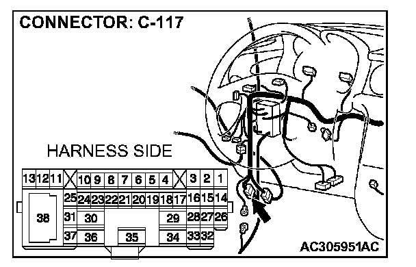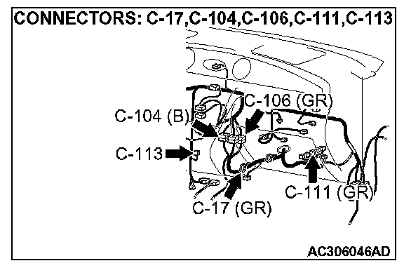 NOTE: Also check intermediate connector C-117, C-106 and joint connector C-17,check the wires. If intermediate connector C-117, C-106 and joint connector C-17 are damaged, repair or replace them. Refer to Harness Connector Inspection.