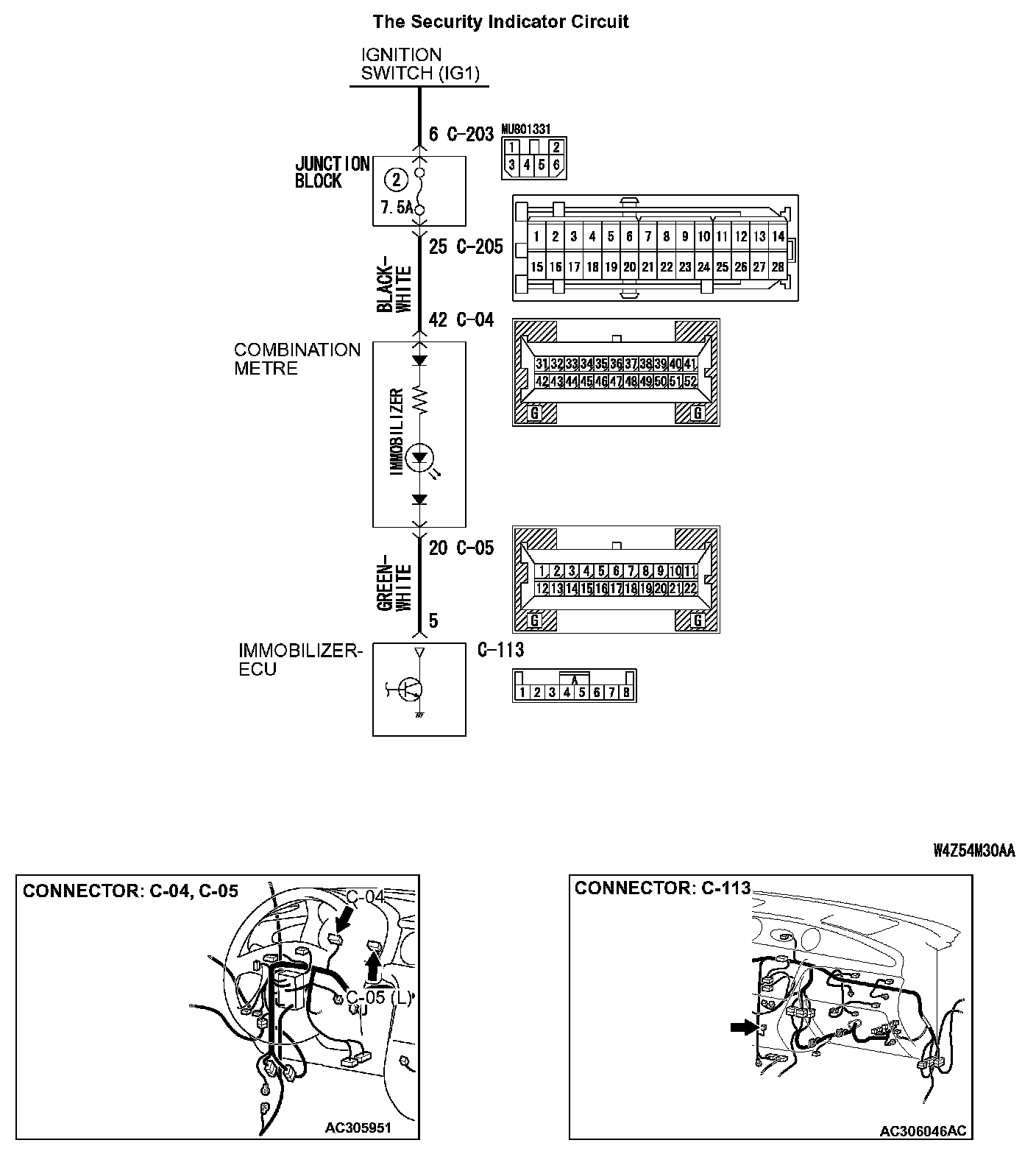 Q: Are immobilizer-ECU connector C-113 and combination meter connector C-05 in good condition?
