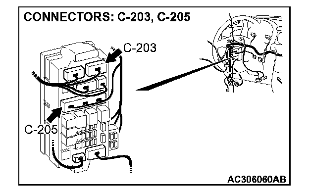 NOTE: Also check junction block connector C-205, C-203 for loose, corroded, or damaged terminals, or terminals pushed back in the connector. If junction block connector C-205, C-203 is damaged, repair or replace it. Refer to Harness Connector Inspection.