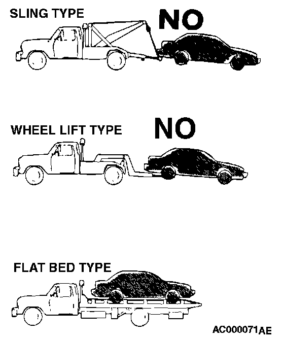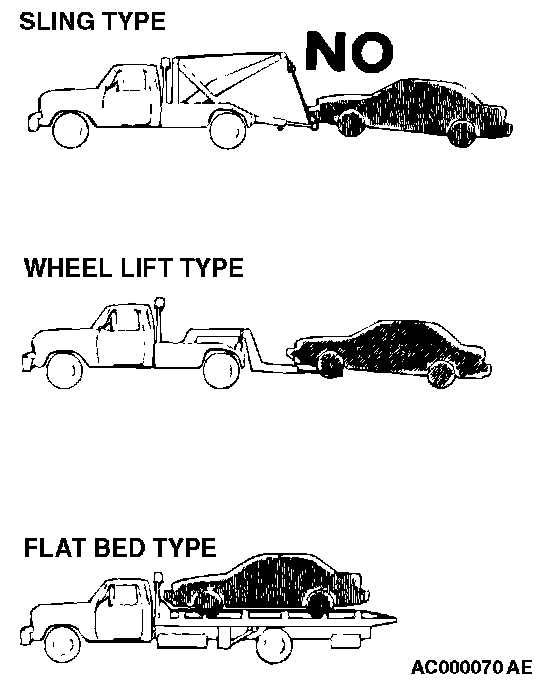 CAUTION: This vehicle cannot be towed by a wrecker using sling-type equipment; otherwise the bumper may become deformed. If this vehicle is towed, use wheel lift or flat bed equipment.