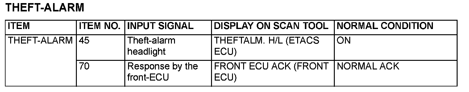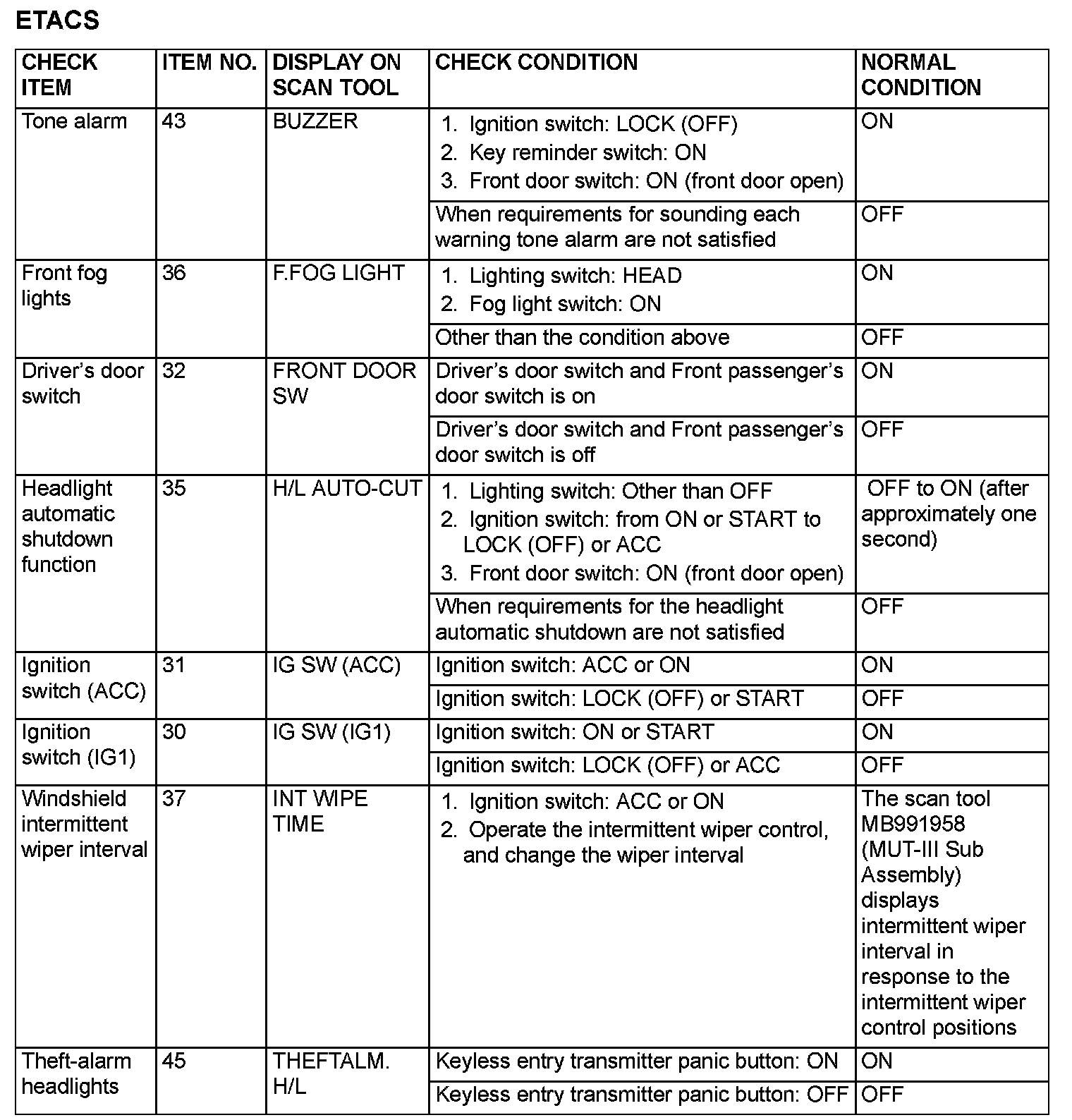 NOTE: For item No.43, the scan tool MB991958 (MUT-III Sub Assembly) also displays "ON" when the light reminder tone alarm or the seat belt tone alarm function is triggered.