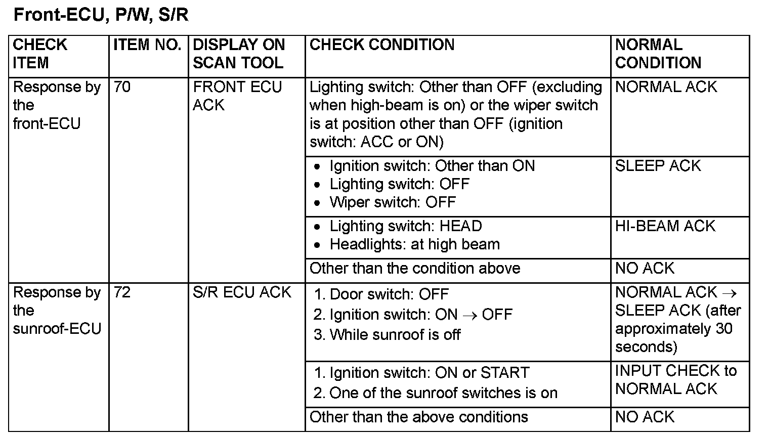NOTE: For item No.72, the scan tool MB991958 (MUT-III Sub Assembly) also displays "NG" under "ECU COMM Check" when it displays "NO ACK" under the sunroof-ECU check.
