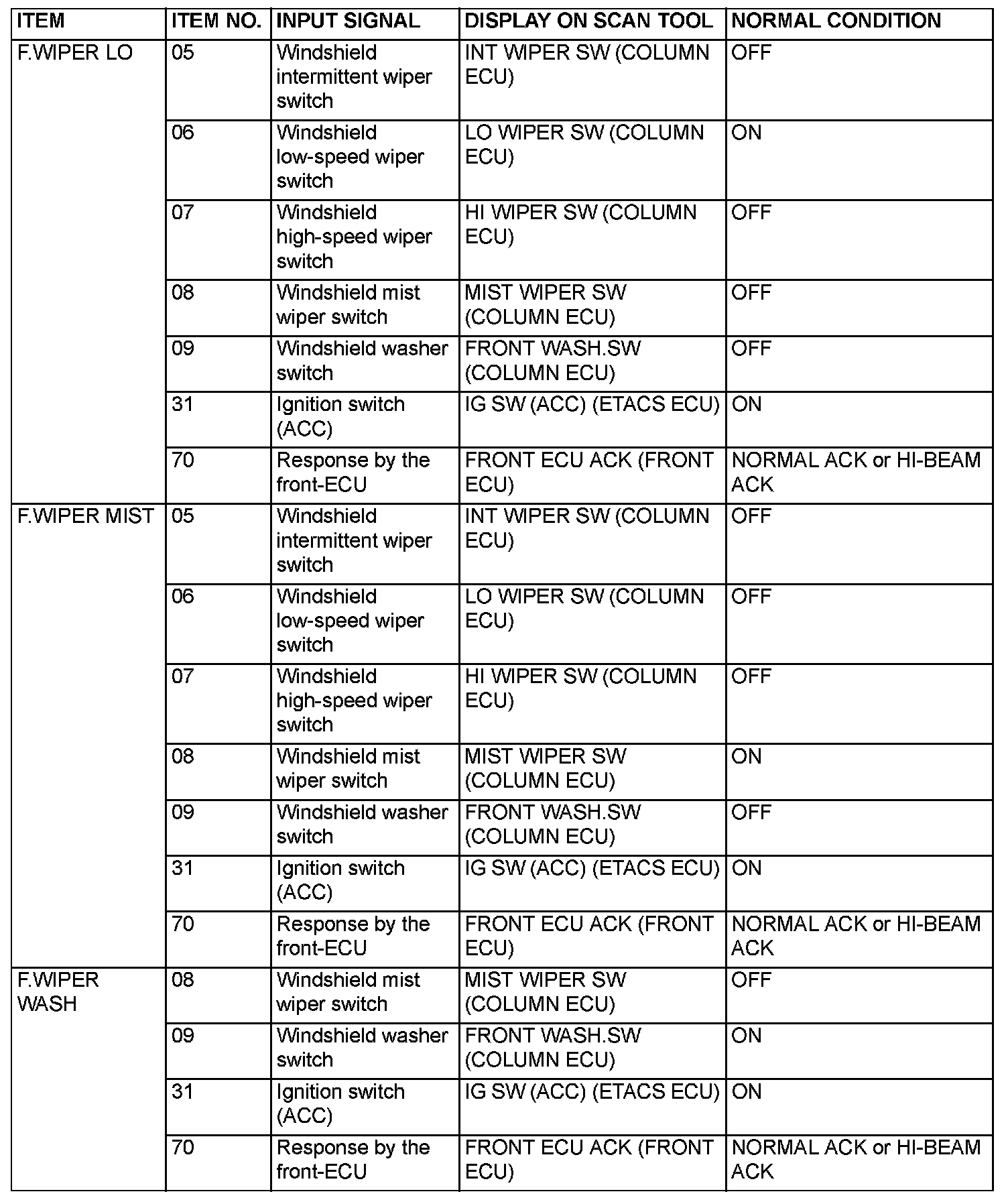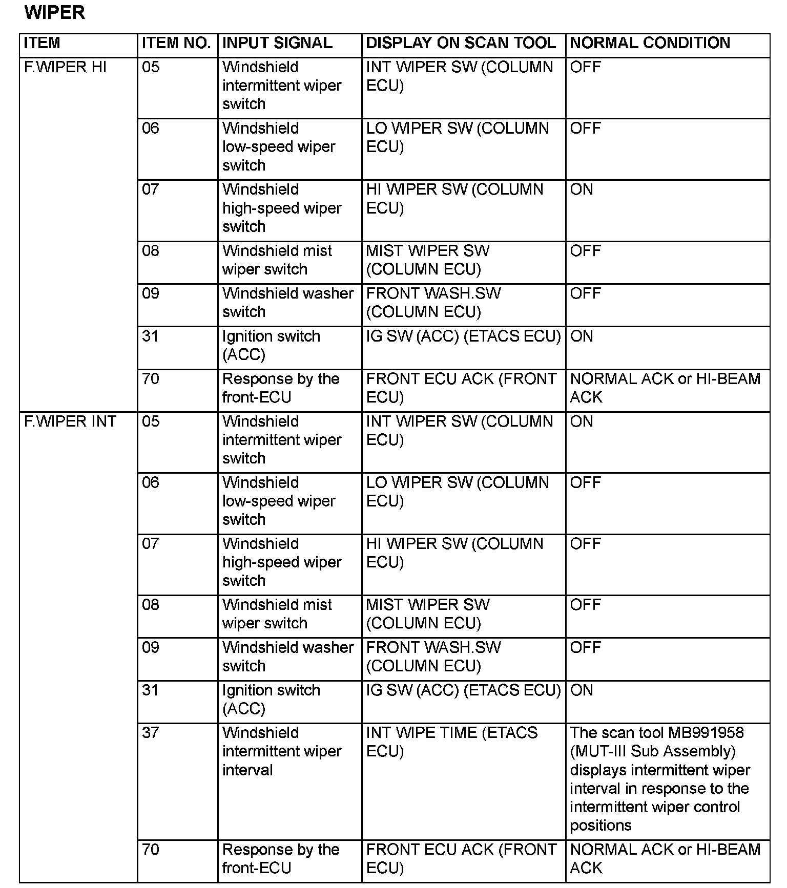 For checking item "HEADLIGHT HI", the scan tool MB991958 (MUT-III Sub Assembly) displays "OFF" on the item No.2 "DIMMER SW" when the headlights are at high-beam. Therefore, the scan tool MB991958 (MUT-III Sub Assembly) should display "ON" momentarily when the dimmer switch is operated.